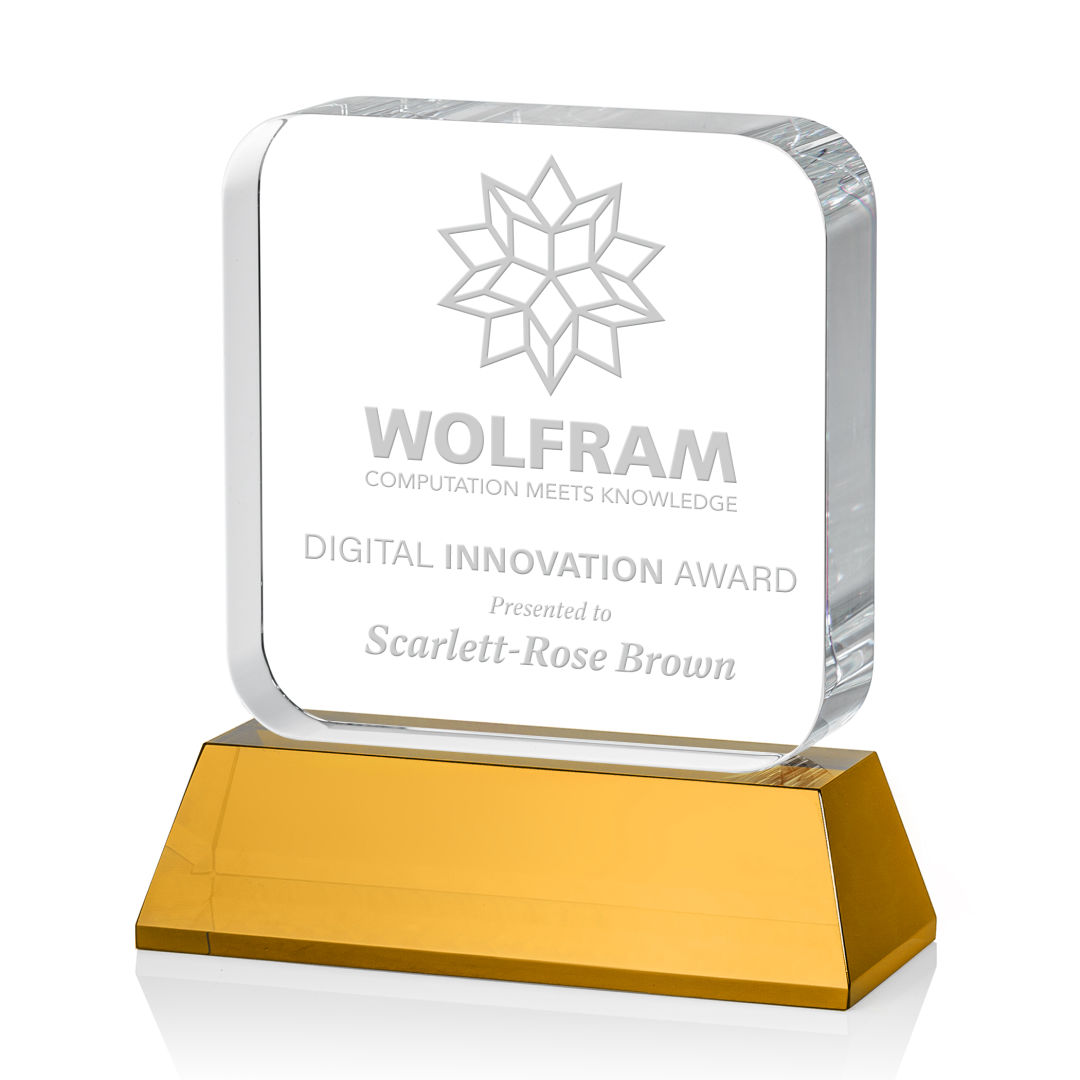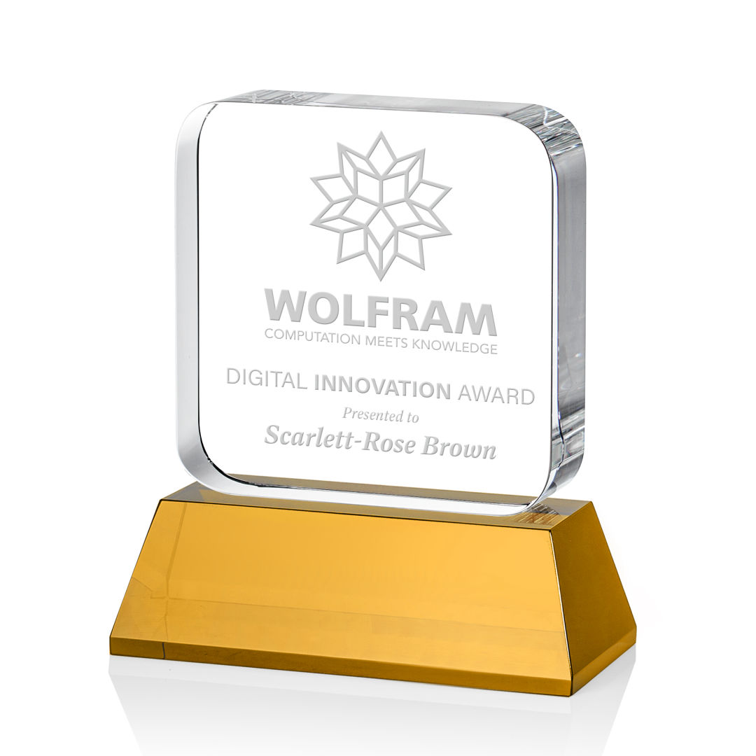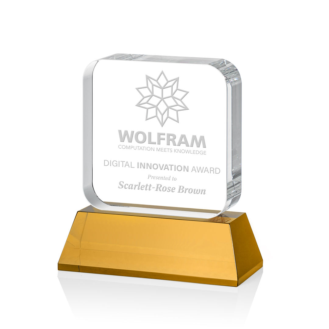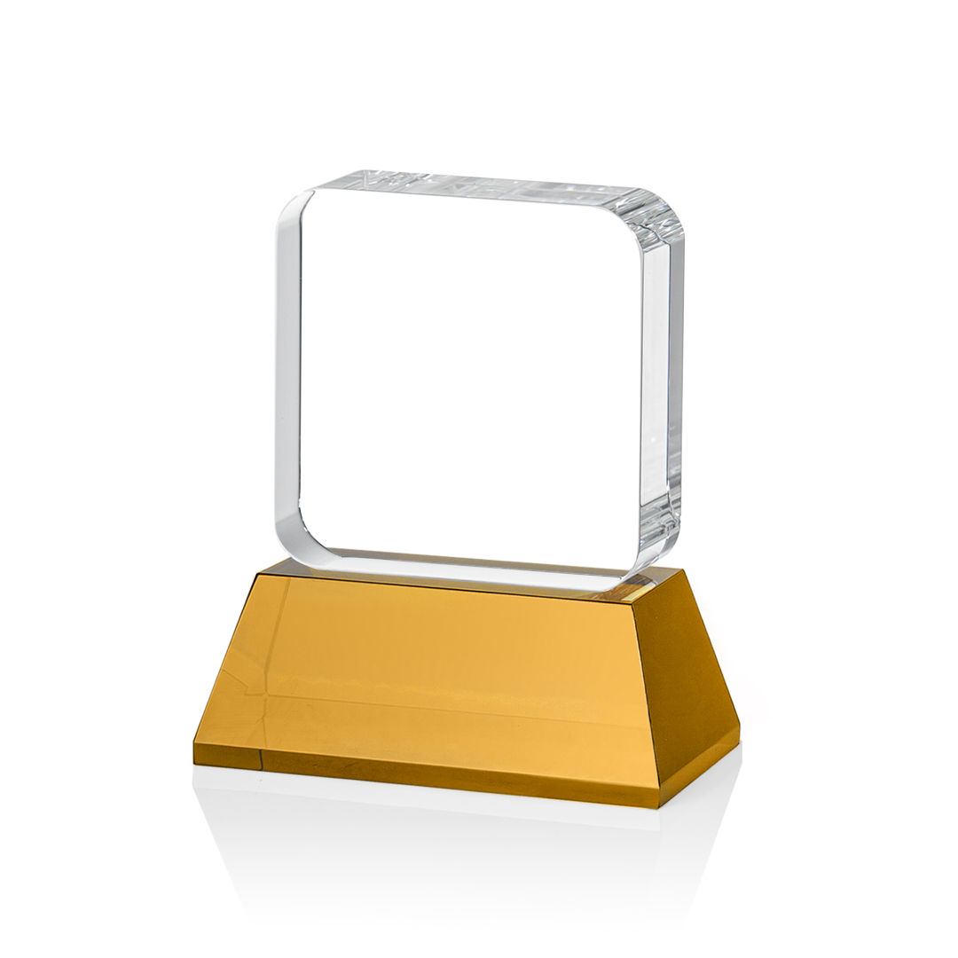 The Flamborough Award on base features a thick optical crystal block with rounded edges that sits atop a magnificent optical crystal amber base. Great for recognizing achievement and innovation in the tech and app world, or any corporate recognition program. Second position etch and colorfill optional. 4.0″ W x 4.5″ H x 2.0″ D