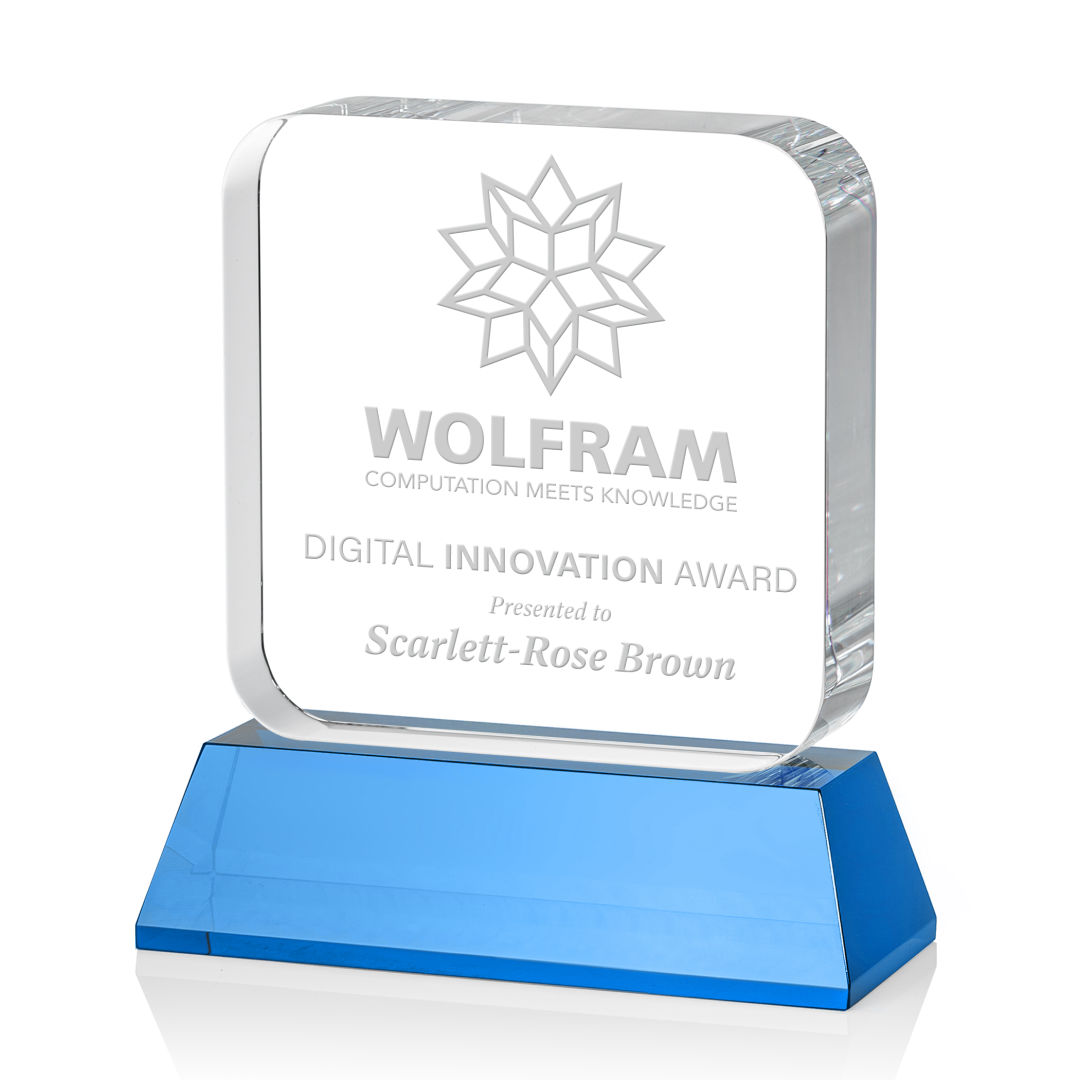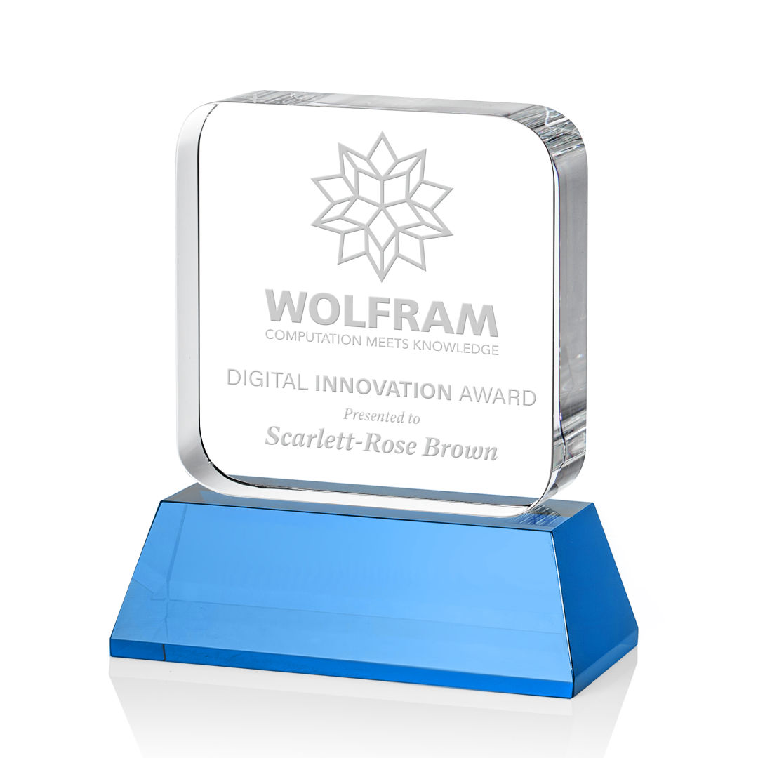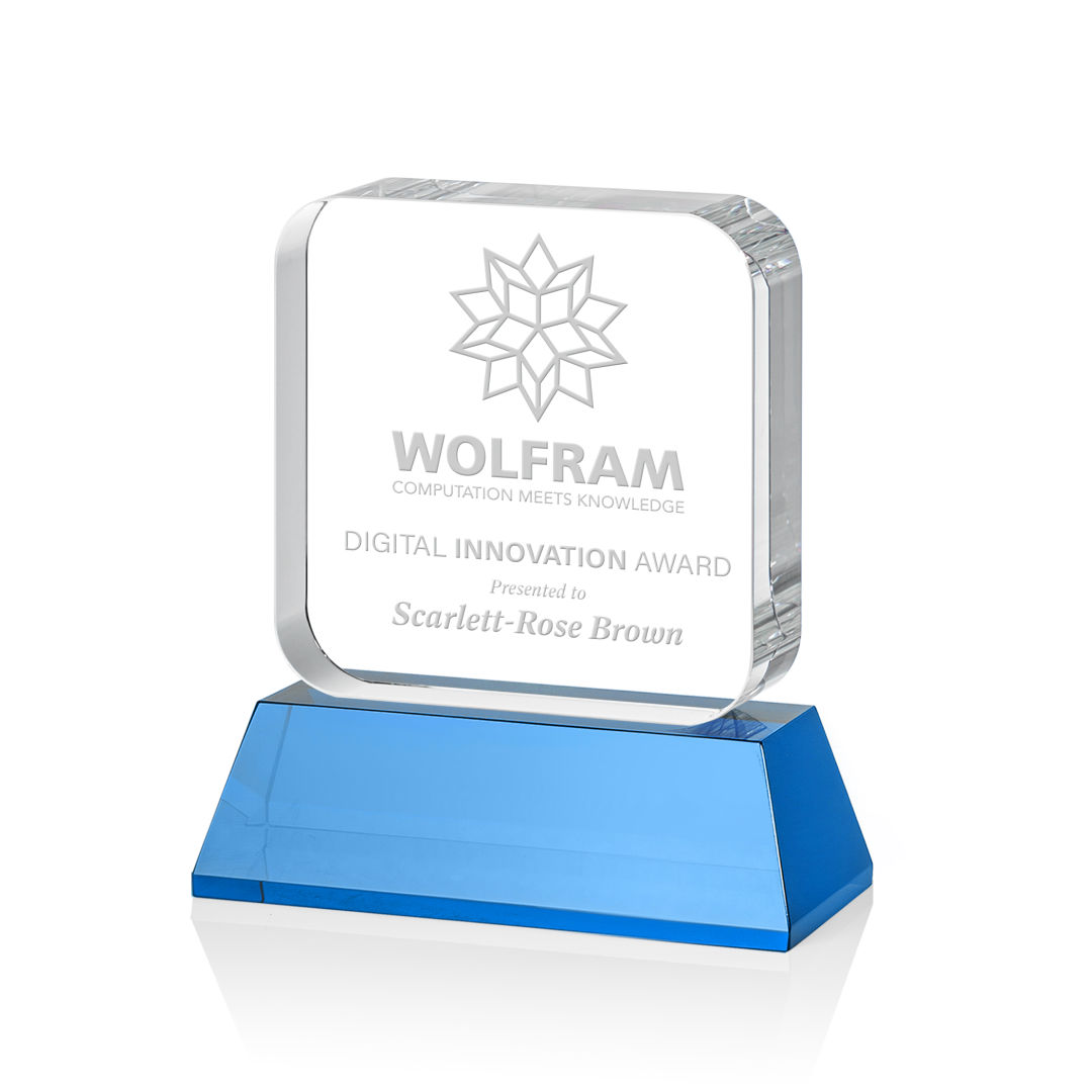 The Flamborough Award on base features a thick optical crystal block with rounded edges that sits atop a magnificent sky blue optical crystal base. Great for recognizing achievement and innovation in the tech and app world, or any corporate recognition program. Second position etch and colorfill optional. 4.0″ W x 4.5″ H x 2.0″ D
