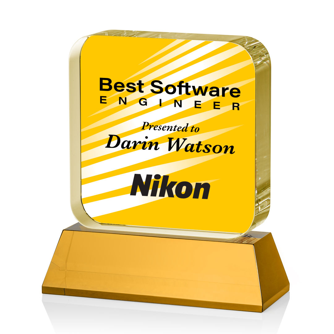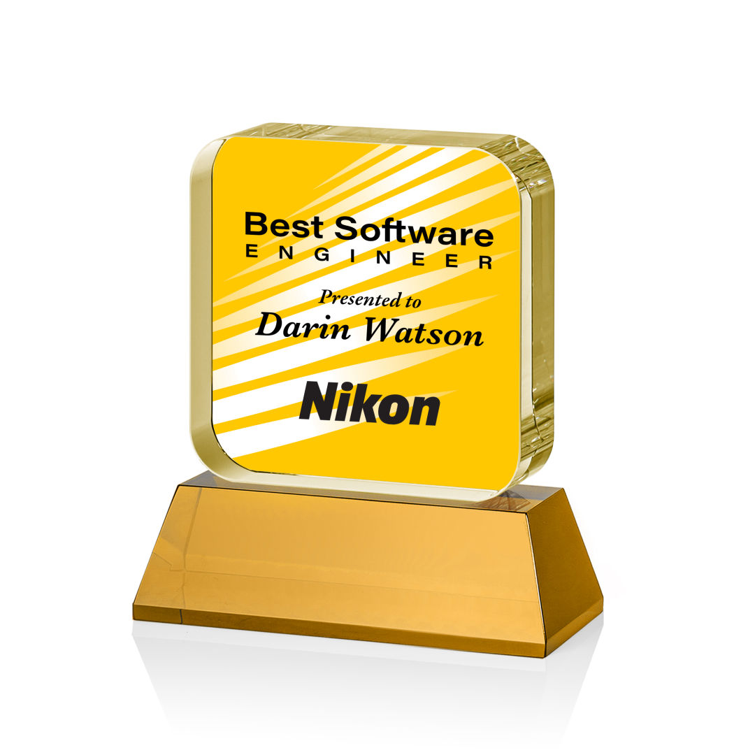 The Flamborough VividPrint™ Award on base features a thick optical crystal block with rounded edges that sits atop a magnificent optical crystal amber base. Great for recognizing achievement and innovation in the tech and app world, or any corporate recognition program. Second position imprint optional. 4.0″ W x 4.5″ H x 2.0″ D