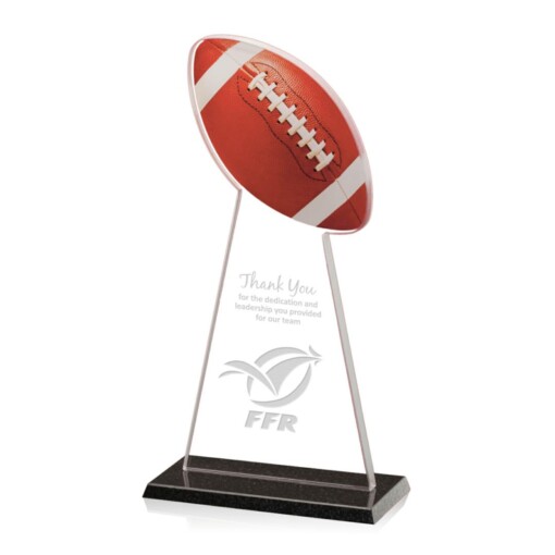 A tall trophy in glass and granite, ideal for recognizing individual or team achievement in football. Whether chosen to commemorate tournaments, applaud exceptional performance, or honour the efforts of players, staff, or volunteers, the Football Tower makes a simple but distinctive memento. The symmetrically sloping sides of the aquashaped 3/8″ starfire upright reach an apex at the contoured shape of the football. The ball itself is Spectra Imaging printed in full color and is visible from both front and back. Additional artwork is either printed in full color or etched on the remaining glass surface. A beveled 3/8″ polished black granite base adds stability, a contrasting color and material accent, and increases perceived value. 5.0″ W x 11.5″ H
