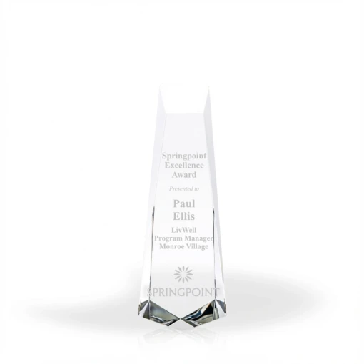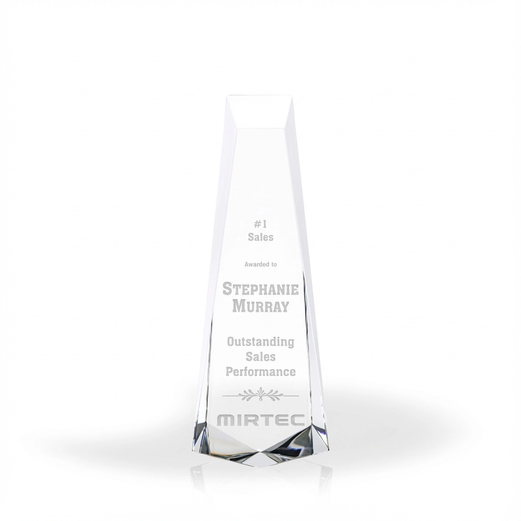 The Foredart Crystal Tower Awards are a gorgeous series of flawless optic crystal awards. These awards make a stunning presentation when included in your recognition program. The Foredart is available in 9″, 10″ & 12″ sizes. Use all three sizes to create a family of awards for different levels of achievement. 9″ H x 3.25″ W x 2″ D