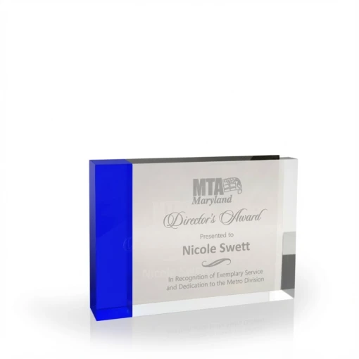 The Forte Crystal Paperweight is a great option when you want to give a small desktop award that will make a big impression on your recipient. The award has a sapphire blue crystal accent stripe on the side that creates a stunning visual statement for your recognition text. The award is 6″ wide and 4″ tall and is .75″ thick. Your logo and award text are engraved on the front side of the award. 4″ H x 6″ W x 3/4″ D