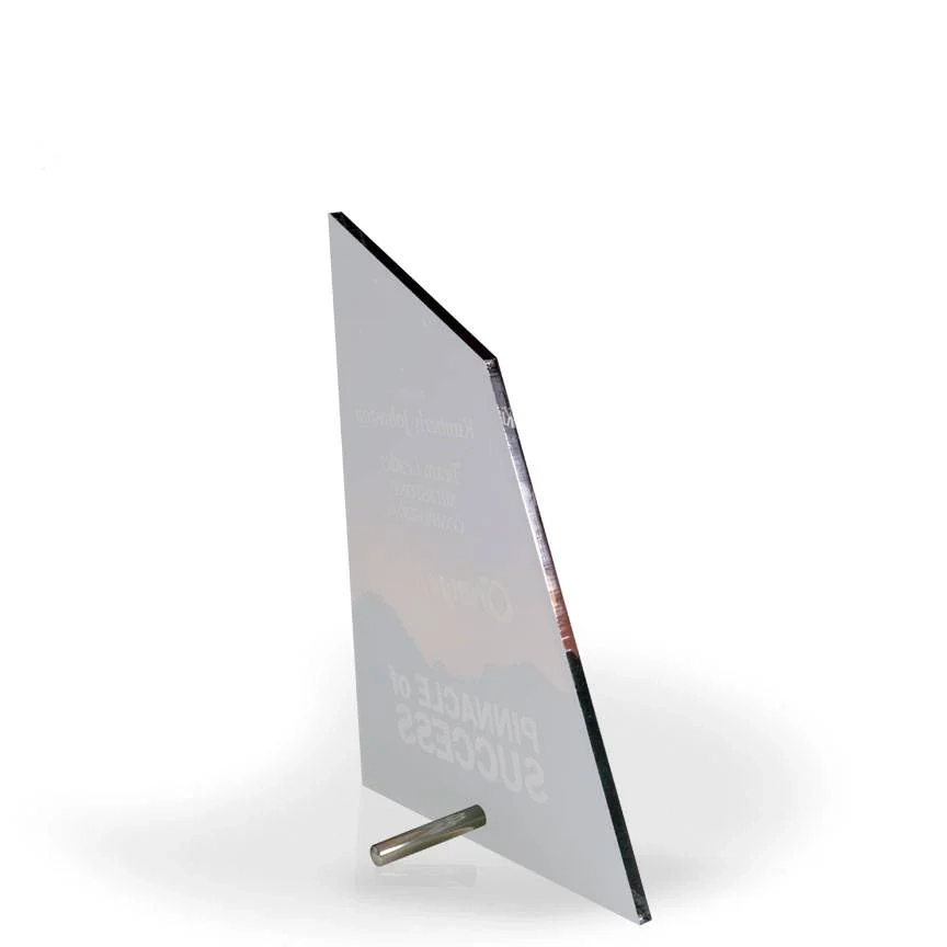 An attractive and affordable award option, our acrylic easel awards are made in the USA with 1/4″ clear acrylic and a 2″ silver-tone pin stand. These budget-friendly awards require minor assembly. The acrylic upright and silver-tone pin stand are packaged together, un-attached, in a slim-line white tri-fold box. NOTE: These awards are shown with sample art, but begin as blank, clear acrylic that can be customized with your logo, text, and graphics. 8″ H x 6″ W x 2″ D