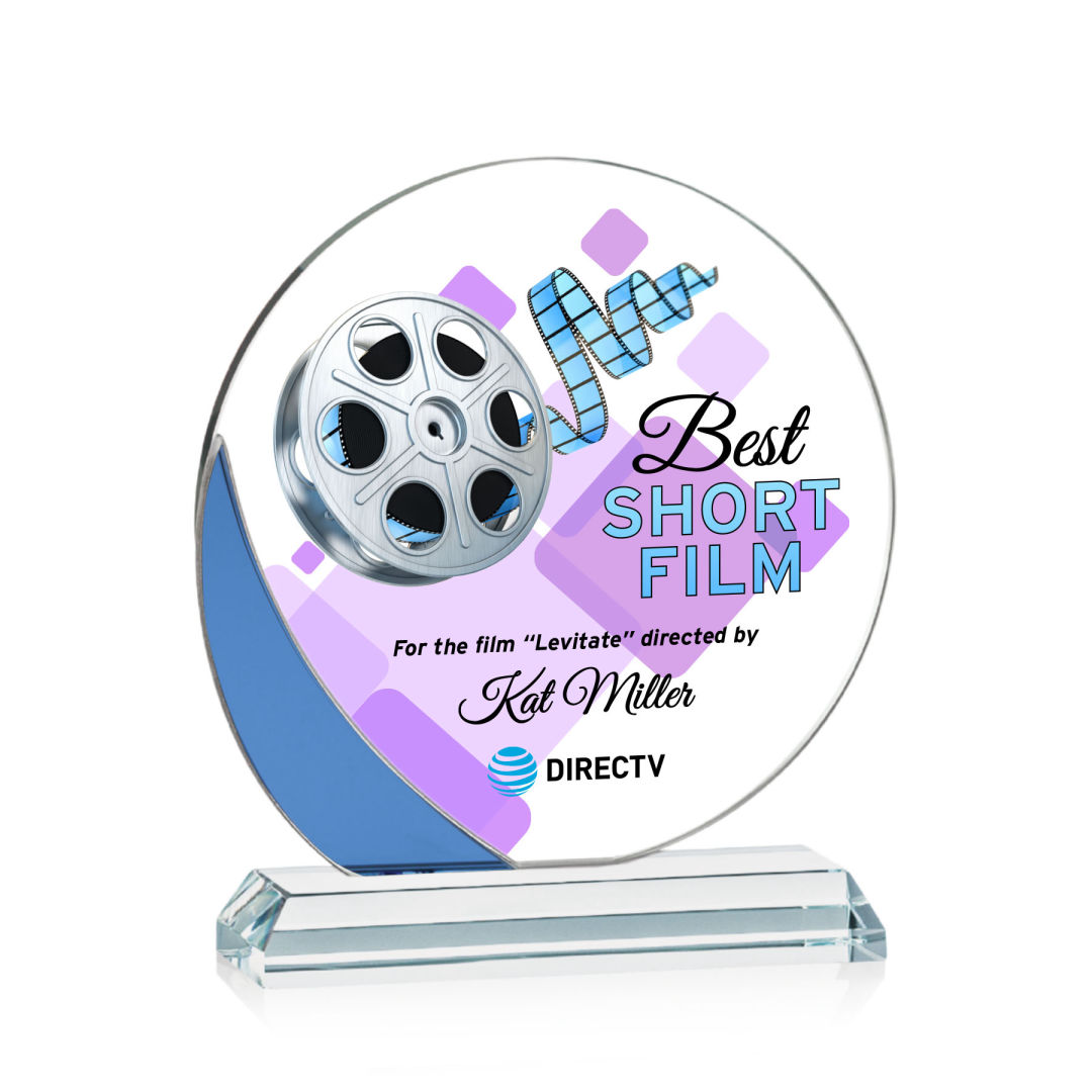 A circular starfire crystal disc is paired with a blue crescent shaped crystal accent, then mounted to a beveled starfire base to create this formal award with modern flair. Let your message POP with full color VividPrint! 5.0″ W x 5.75″ H