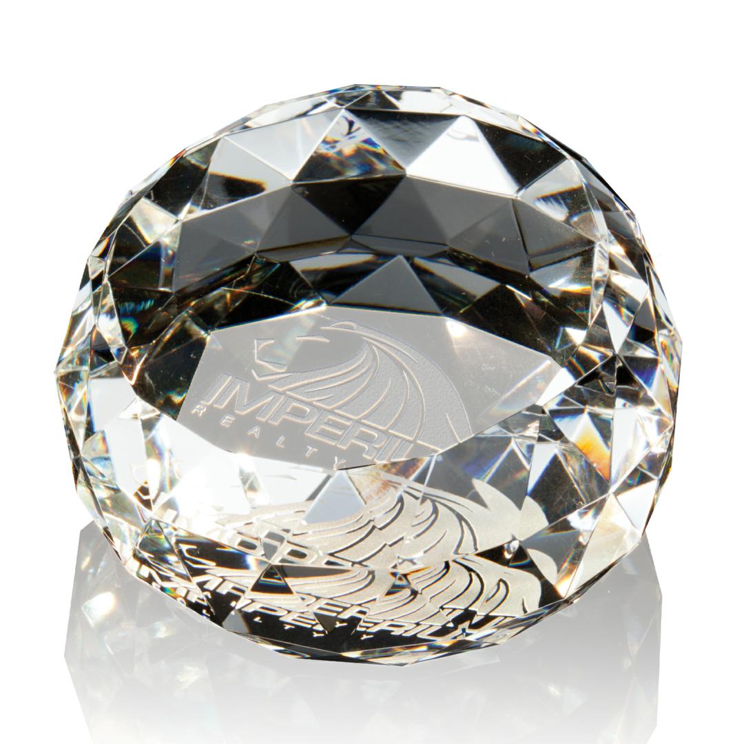 The Gem Cut Paperweight, in flawless optical crystal, is a 3″ diameter circle with bands of intricately cut facets around the perimeter, a sloping top surface, and a central flat area on the underside which serves as the usual etching surface. The complex of facets produces a kaleidoscope of reflected and refracted colors from the award’s surroundings. 3.0″ W