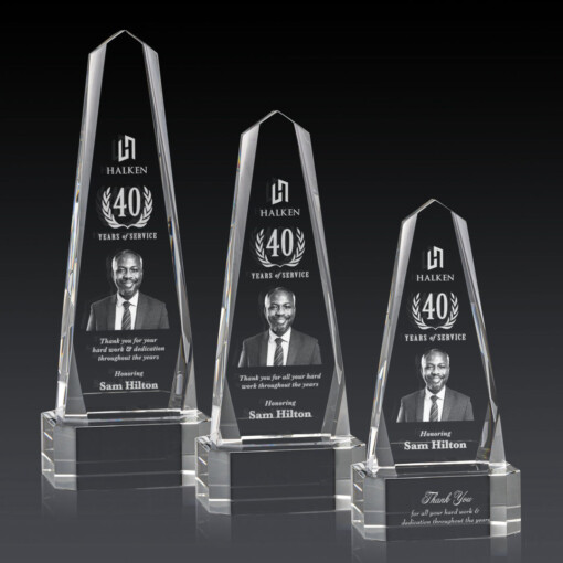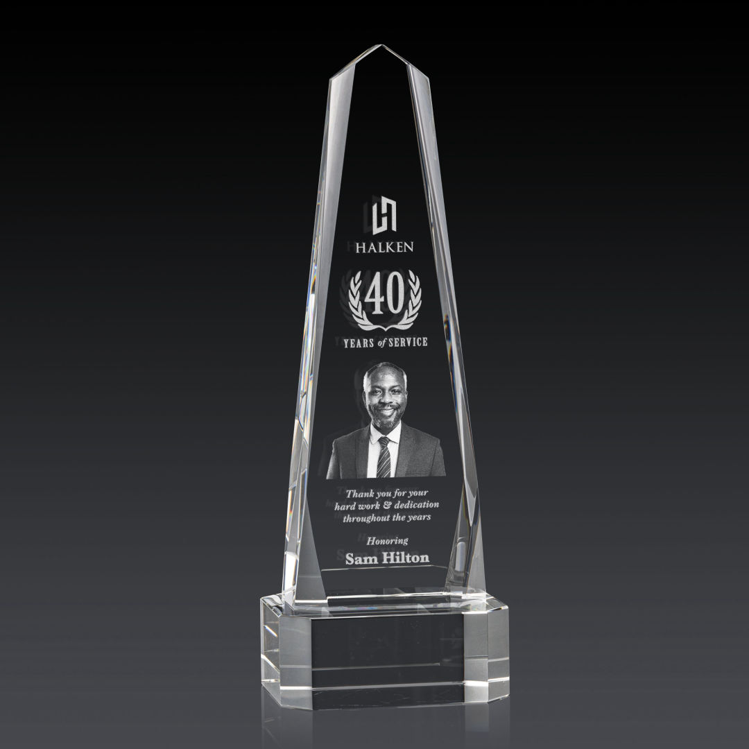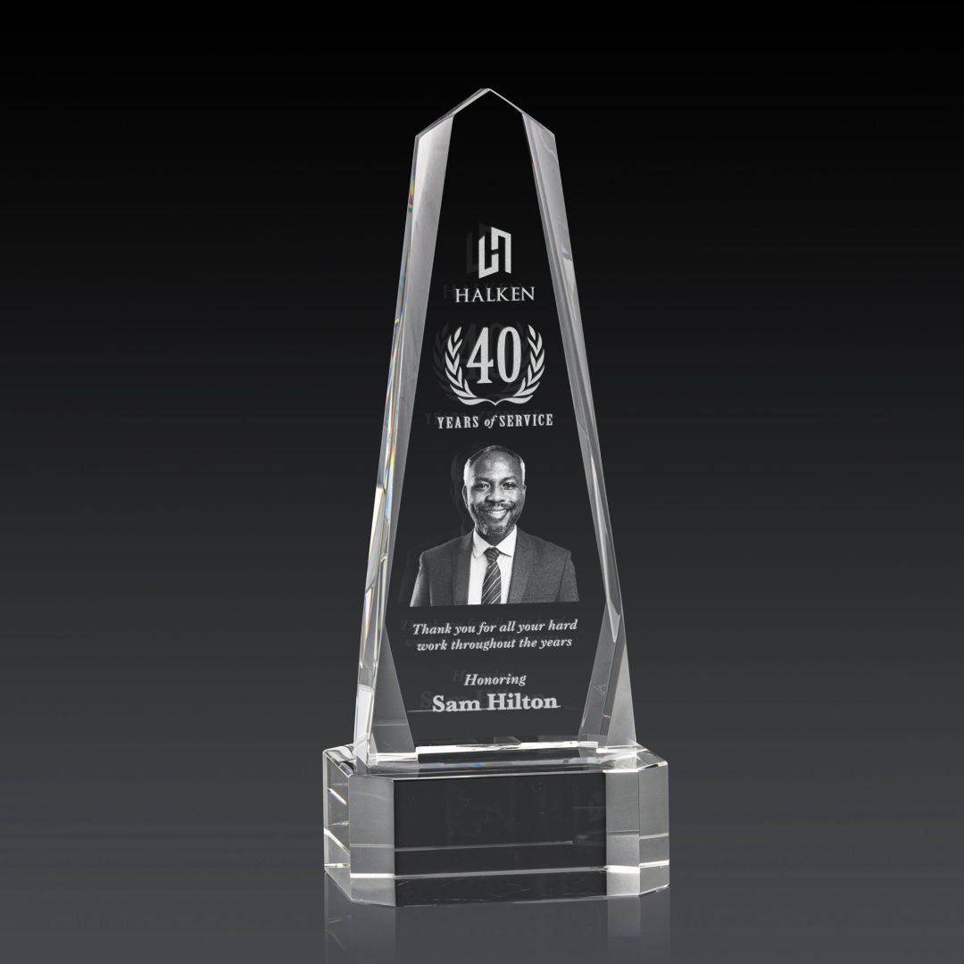 The Optical Crystal Geneva 3D Award is an obelisk that features a mesmerizing design with interchanging bevels, lending it a dynamic and captivating appearance. Each facet catches and reflects light, creating a dazzling display that symbolizes the multifaceted nature of success. Mounted on an extra-thick optical base in your choice of clear, emerald, sapphire or ebony. Take our deep etch process even deeper with our incredible subsurface Dimensions 3D Engraving. Our 3D Pop process creates a simulated 3D effect from a 2D photo. For a true 3D engraving, please provide a 3D engraving file (.obj), or we can redraw it for a fee. 4.0″ W x 8.5″ H x 3.0″ D