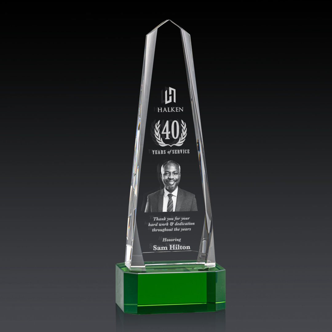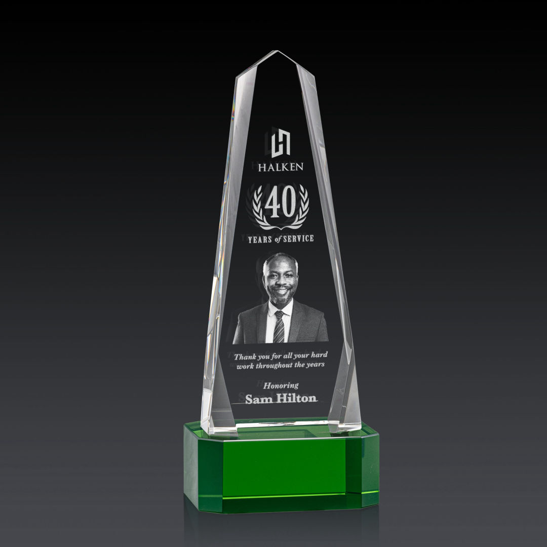 The Optical Crystal Geneva 3D Award is an obelisk that features a mesmerizing design with interchanging bevels, lending it a dynamic and captivating appearance. Each facet catches and reflects light, creating a dazzling display that symbolizes the multifaceted nature of success. Mounted on an extra-thick optical base in your choice of clear, emerald, sapphire or ebony. Take our deep etch process even deeper with our incredible subsurface Dimensions 3D Engraving. Our 3D Pop process creates a simulated 3D effect from a 2D photo. For a true 3D engraving, please provide a 3D engraving file (.obj), or we can redraw it for a fee. 4.0″ W x 8.5″ H x 3.0″ D