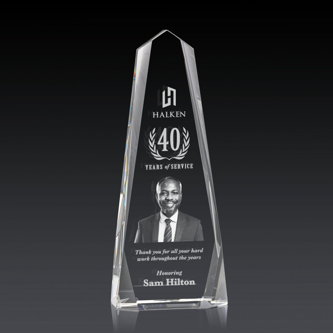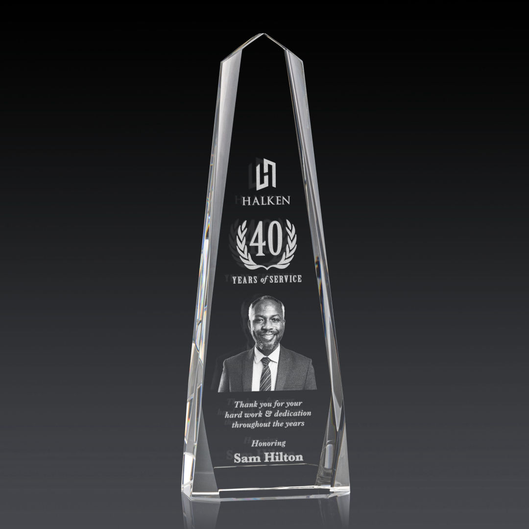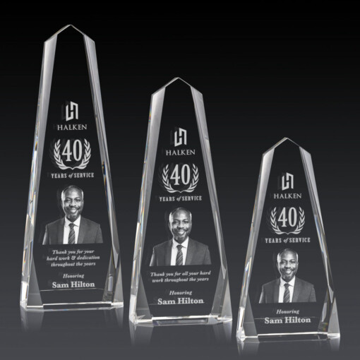 The freestanding Optical Crystal Geneva 3D Award is an obelisk that features a mesmerizing design with interchanging bevels, lending it a dynamic and captivating appearance. Each facet catches and reflects light, creating a dazzling display that symbolizes the multifaceted nature of success. Take our deep etch process even deeper with our incredible subsurface Dimensions 3D Engraving. Our 3D Pop process creates a simulated 3D effect from a 2D photo. For a true 3D engraving, please provide a 3D engraving file (.obj), or we can redraw it for a fee. 3.5″ W x 7.0″ H x 1.875″ D
