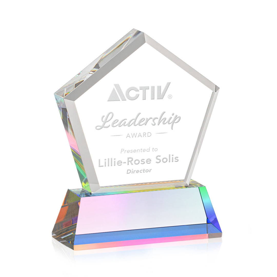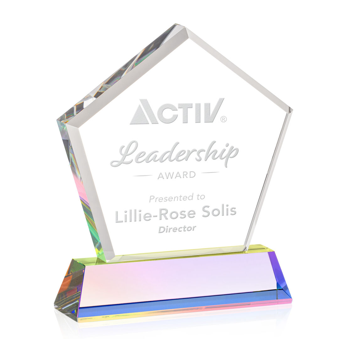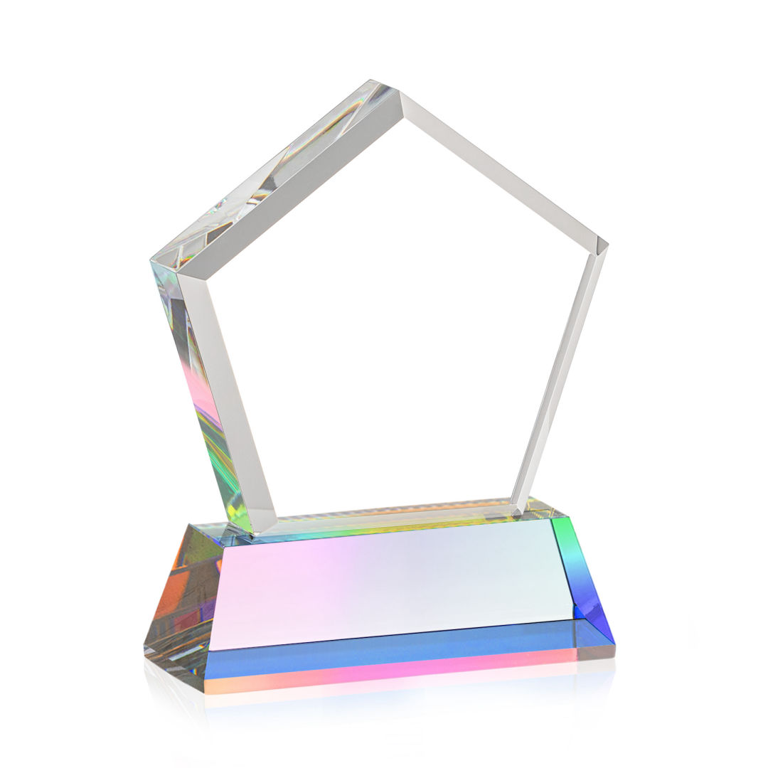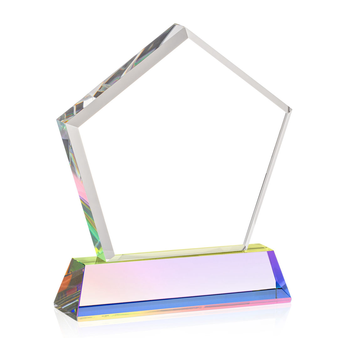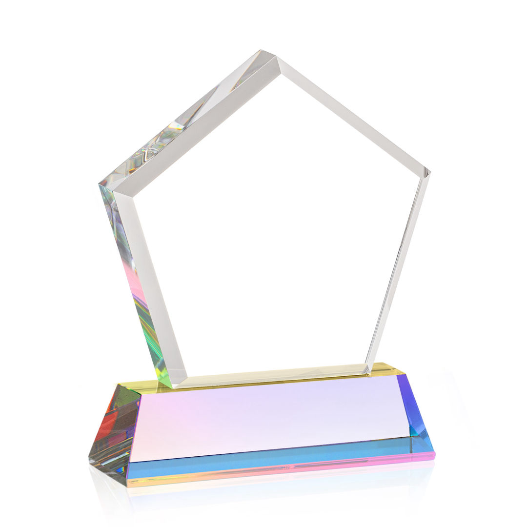 The Genosee VividPrint™ Award is a sparkling faceted extra-thick Optical Crystal pentagon with a large window for decorating your words of encouragement and inspiration. A marvelous award to recognize a spectacular achievement. Mounted on a prismatic Optical Crystal base. Second position etch is optional. 4.125″ W x 5.5″ H x 2.0″ D