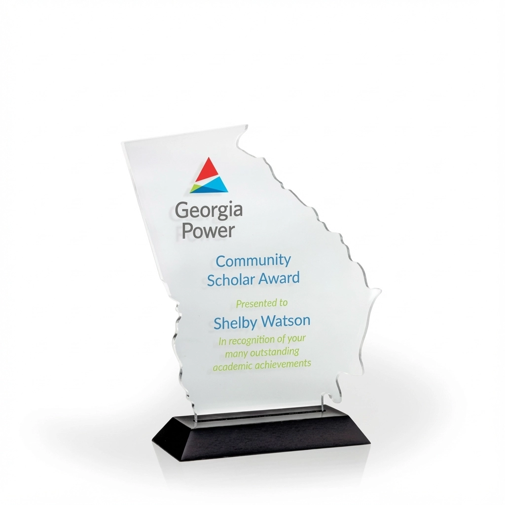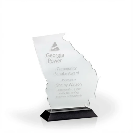 An attractive and affordable award option, our acrylic cutout awards are made in the USA with 1/4″ clear acrylic and a black, beveled wood base. These budget-friendly awards require minor assembly. The acrylic pop-in and wood base are packaged together, un-attached, in a slim-line white tri-fold box. 7.75″ H x 5.25″ W x 2″ D
