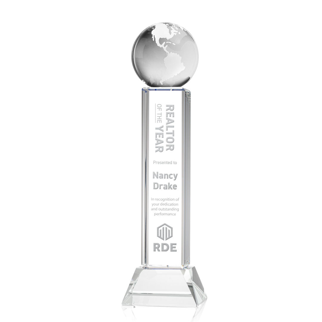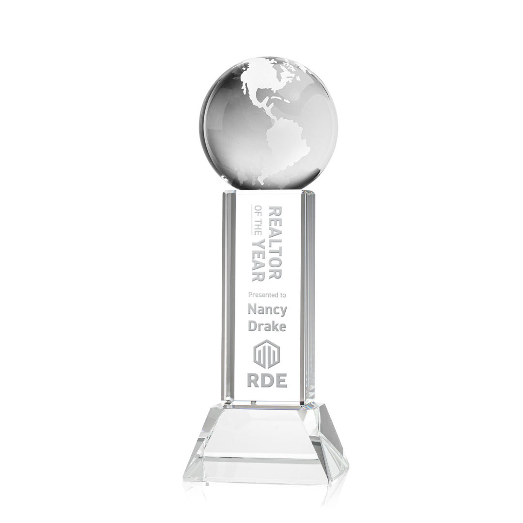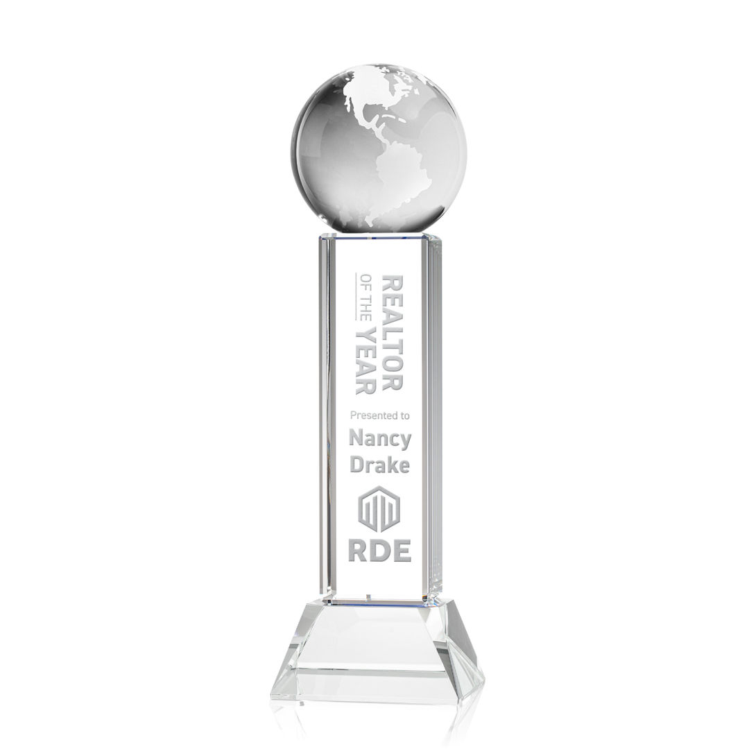 Celebrate outstanding achievements with our perfectly shaped Optical Crystal Globe Award, elegantly mounted on a handsome base and designed to rotate freely, symbolizing global excellence. This exquisite award offers a perfect fit for any recognition ceremony. Honor your recipients with a timeless piece that reflects their exceptional contributions and global impact. Second position etch optional. 4.0″ W x 6.0″ H x 4.0″ D