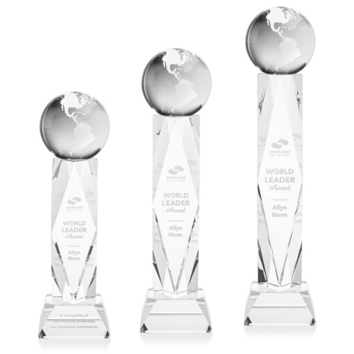 Celebrate outstanding achievements with our perfectly shaped Optical Crystal Globe Award, elegantly mounted on a handsome base and designed to rotate freely, symbolizing global excellence. This exquisite award offers a perfect fit for any recognition ceremony. Honor your recipients with a timeless piece that reflects their exceptional contributions and global impact. Second position etch optional. 4.0″ W x 10.0″ H x 4.0″ D
