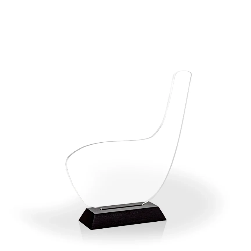 An attractive and affordable award option, our acrylic cutout awards are made in the USA with 1/4″ clear acrylic and a black, beveled wood base. These budget-friendly awards require minor assembly. The acrylic pop-in and wood base are packaged together, un-attached, in a slim-line white tri-fold box. 8″ H x 7.5″ W x 2″ D