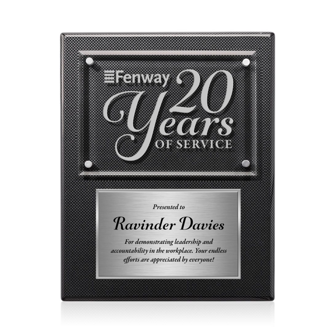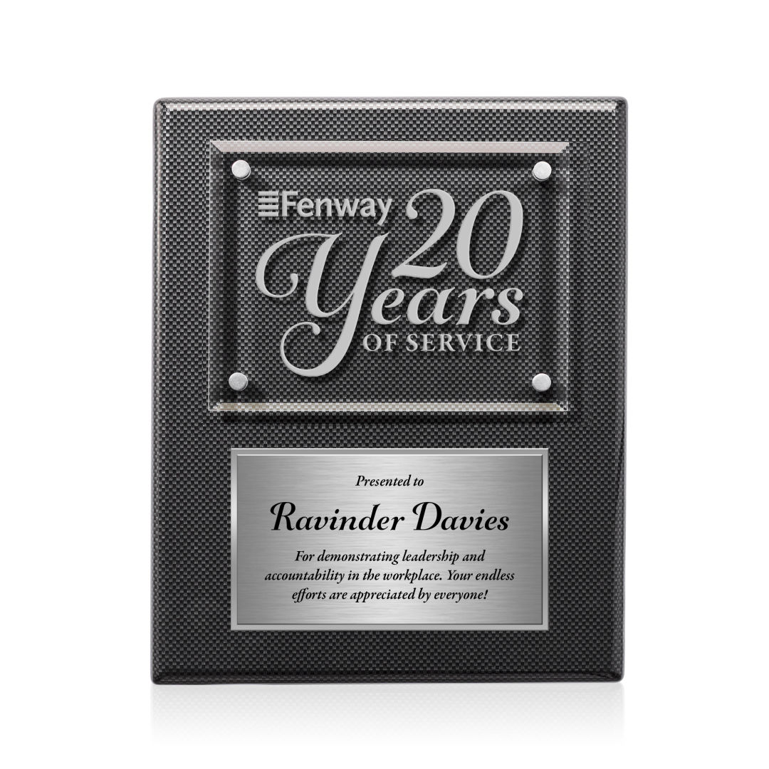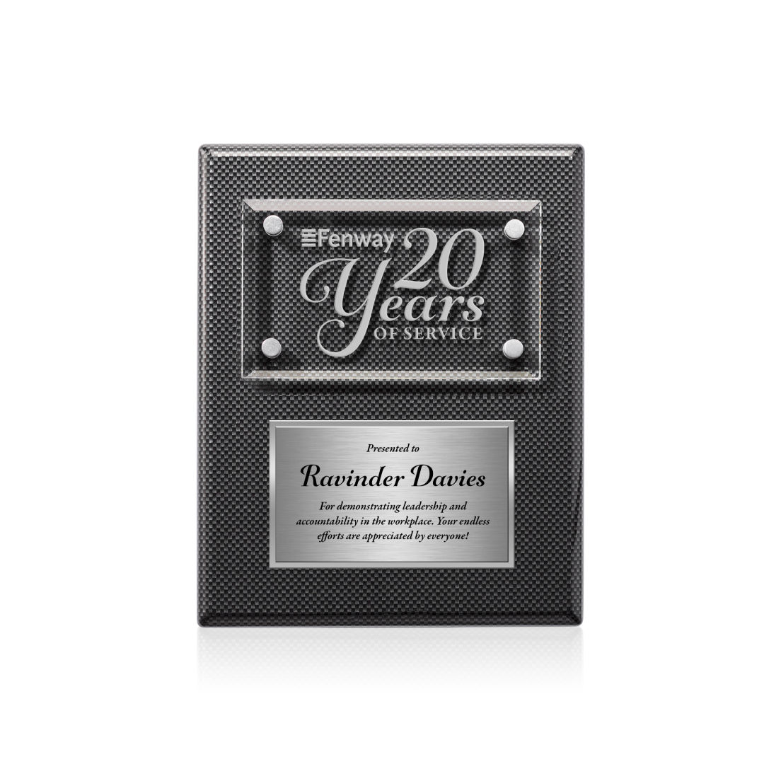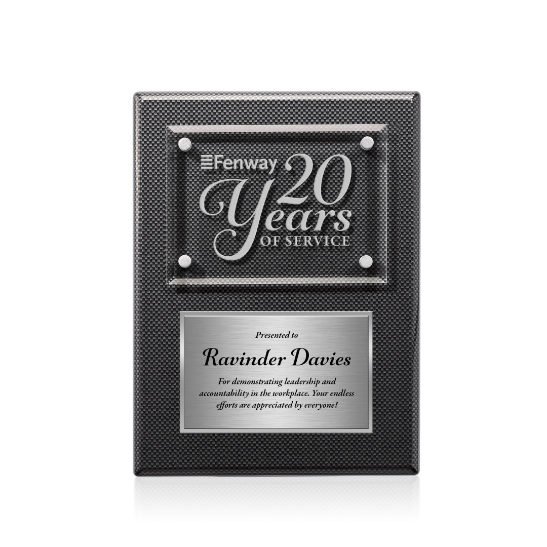 The contemporary and bold look of the Gossamer Wall Plaque will shine a spotlight on your special achievement. Features beveled Starfire Crystal with with deep etch and one color and offset from a solid piano finished carbon fiber backing. Includes a two tone, brushed and polished silver double plate. 7.0″ W x 9.0″ H
