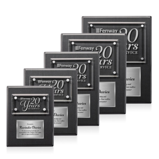 The contemporary and bold look of the Gossamer Wall Plaque will shine a spotlight on your special achievement. Features beveled Starfire Crystal with with deep etch and one color and offset from a solid piano finished carbon fiber backing. Includes a two tone, brushed and polished silver double plate. 7.0″ W x 9.0″ H