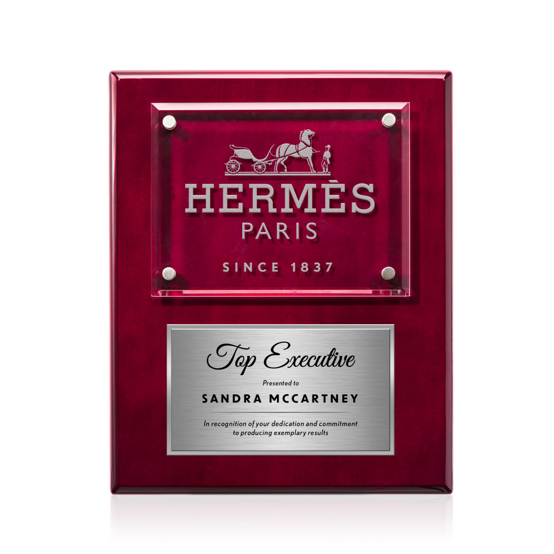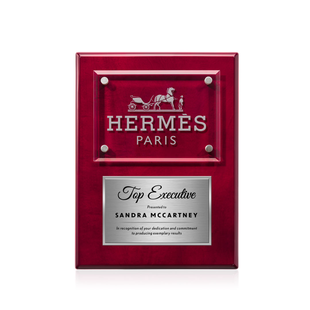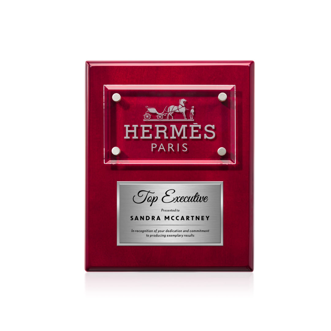 The refined and regal look of the Gossamer Wall Plaque will shine a spotlight on your special achievement. Features beveled Starfire Crystal, hand deep etched and offset from a solid Piano Finished Rosewood backing. Includes a two tone, brushed and polished silver double plate. 7.0″ W x 9.0″ H