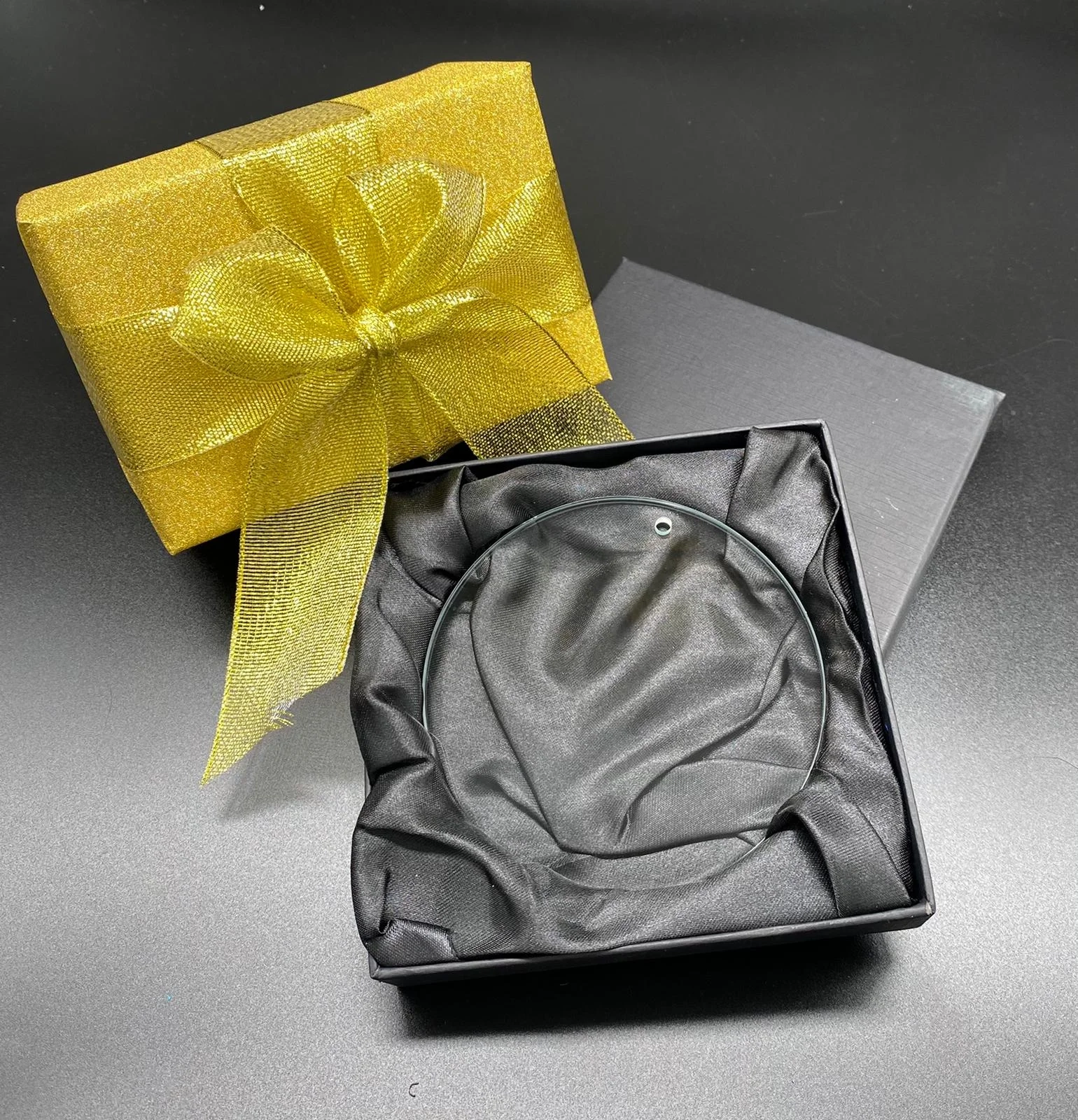 The Grace Ornament is manufactured using the finest quality Crystal Clear Glass. It is used both as an Ornament and as a Medallion. Each Grace Ornament comes in a premium presentation box. 3.1″ H x 3.1″ W x 0.2″ D