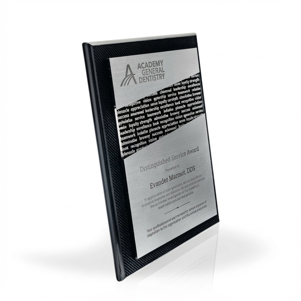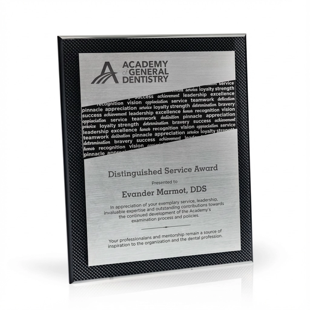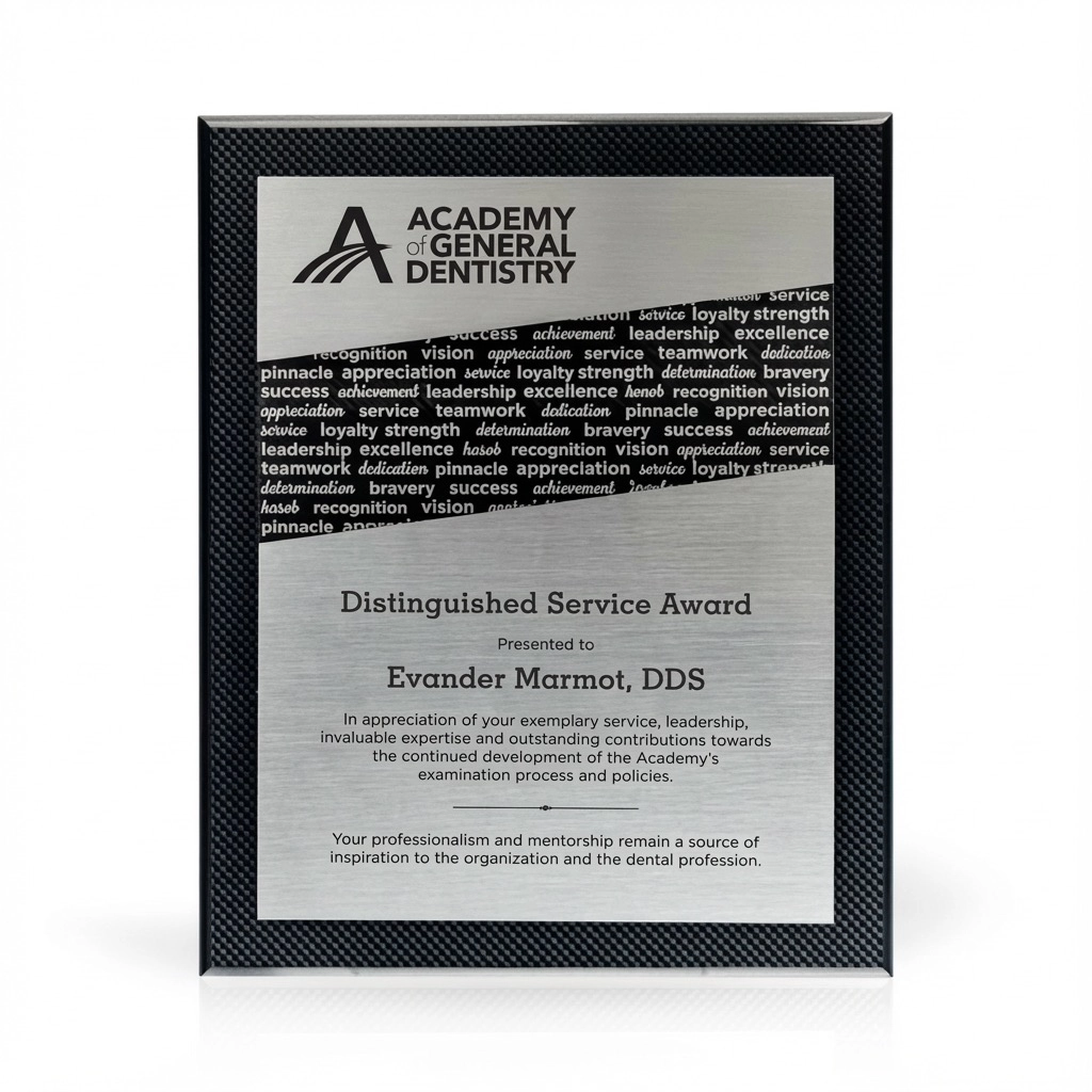 The Graphite Words of Appreciation Plaque makes a statement on any wall. This large sized plaque is made from a composite material that is durable and strong, while not being too cumbersome. The back panel of the award measures 10″ x 13″ and is comprised of a textured black Carbon Fiber plaque. A front, acrylic panel is adhered that features a metallic bottom and top section that can be printed with award information. A middle section of the front panel is “cut out” and features pre-printed messages of appreciation. There is plenty of room above and below that content for adding custom details. This plaque is well suited as a sales achievement award, customer service award, or for any type of corporate recognition. 13″ H x 10.5″ W x 1″ D