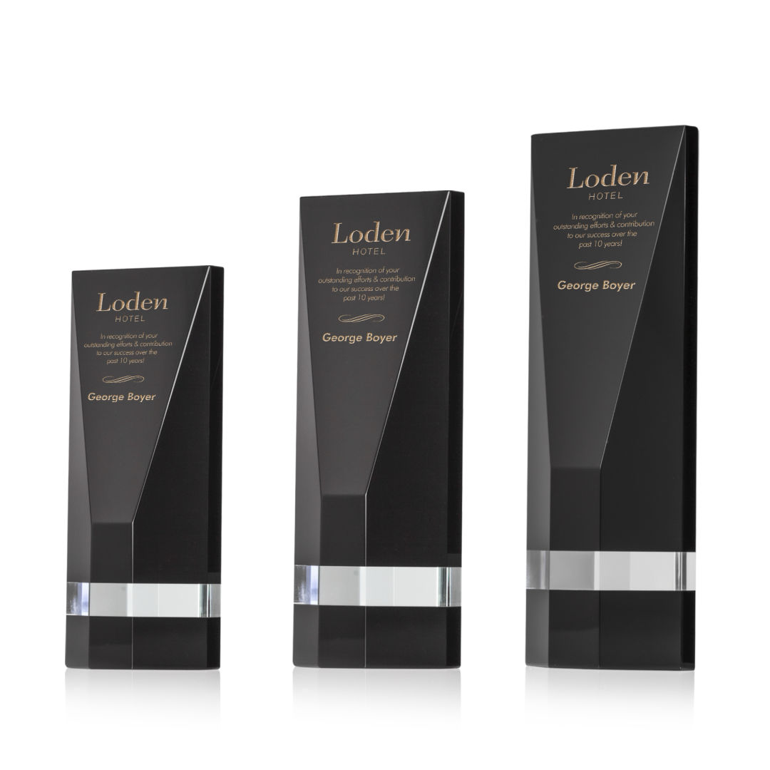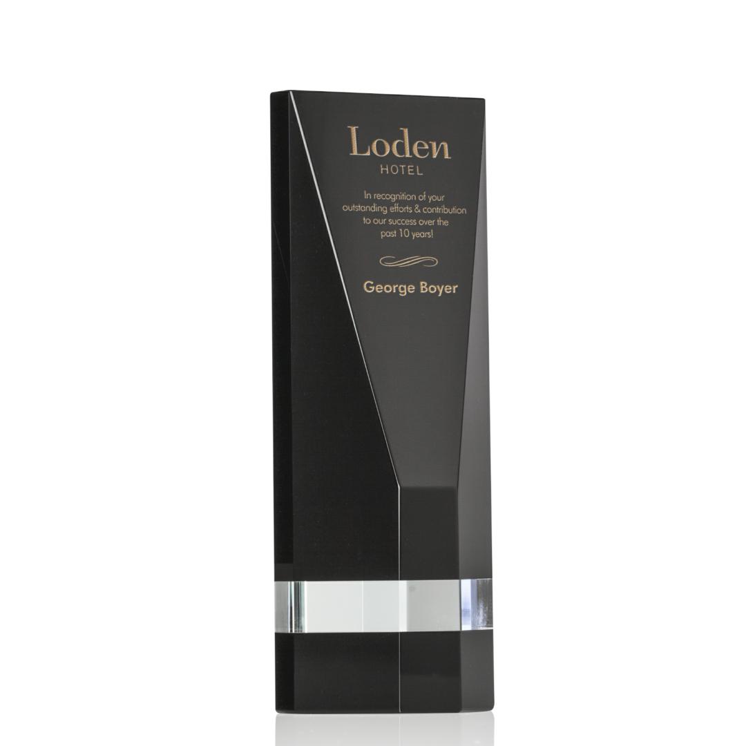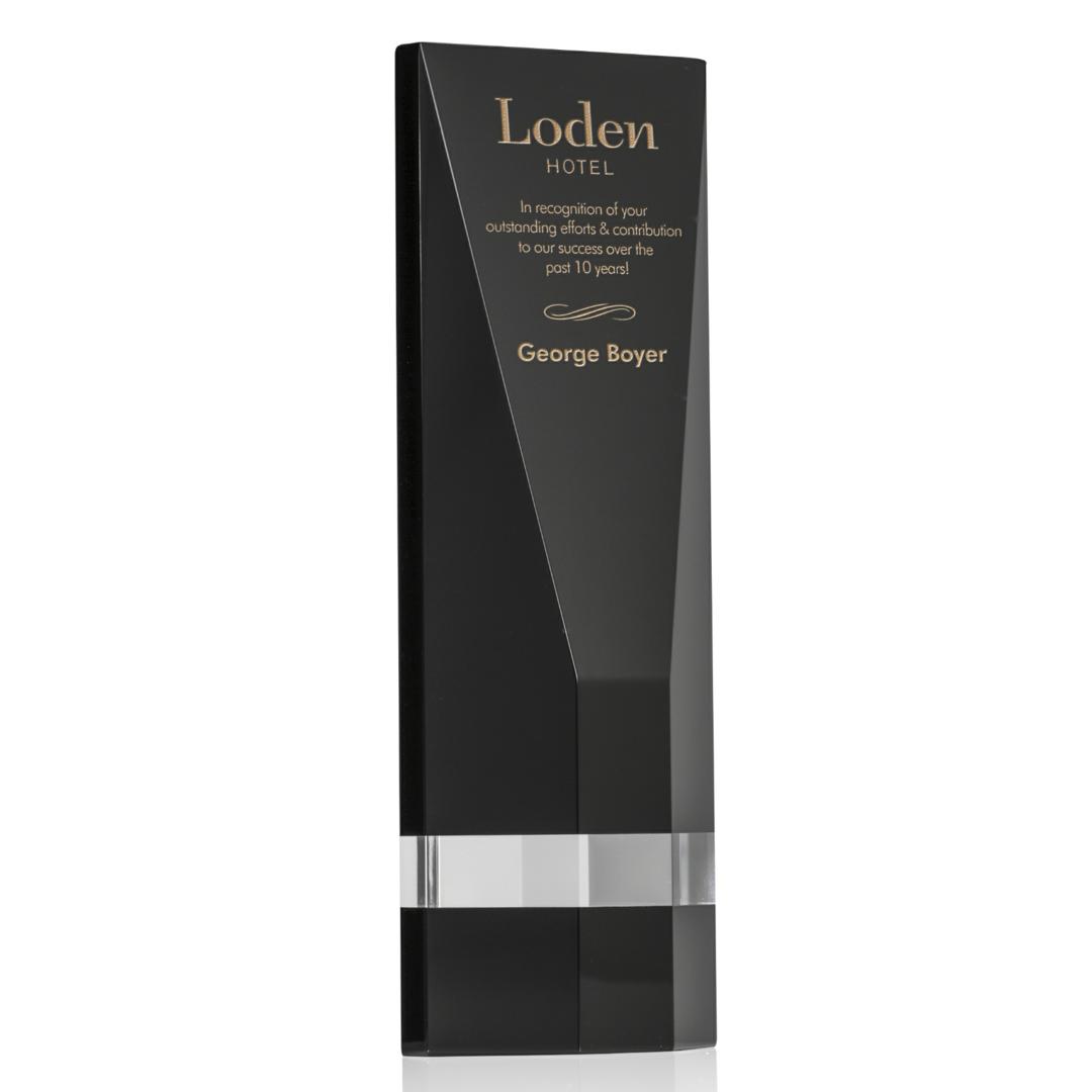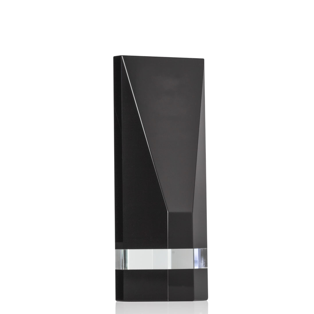 The beveled Gravenhurst tower is created from ebony optical crystal with a clear optical crystal inlay that ignites with light, making the top portion appear to float. 2.75″ W x 6.5″ H x 2.0″ D