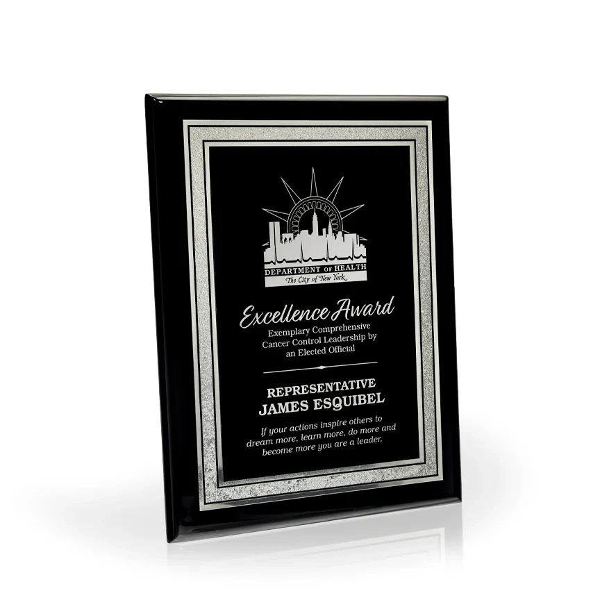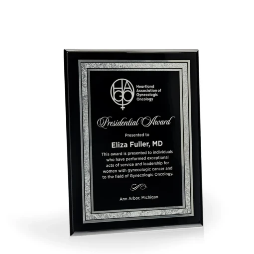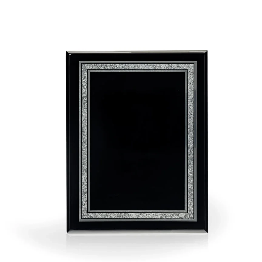 The Gregor Black Piano Plaque is a beautiful and sleek award plaque that would be a great choice for any occasion. The plaque has a satin silver plate with a detailed florentine border on a black high-gloss piano finish board. You can choose between two sizes, 8″ x 10″ and 9″ x 12″, and it can be hung vertically or horizontally. 10″ H x 8″ H x 1.25″ D