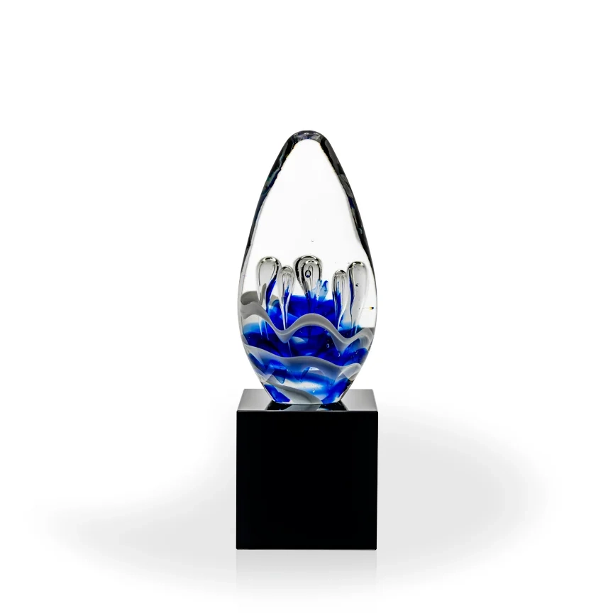 The Halsted Art Glass Award is a perfect award when you want something unique and bright. This award has blue and white waves on the inside of the egg shaped glass and sits atop a black crystal base. The engraving will be silver filled for readability. Art glass awards are hand blown, and each piece will be slightly different in color, shape, and size. Bubbles and swirls are a part of the process and are considered normal and acceptable. 9.25″ H x 3″ W x 3″ D