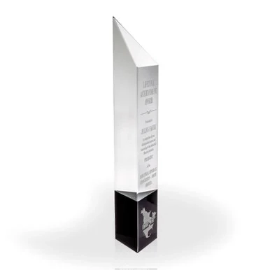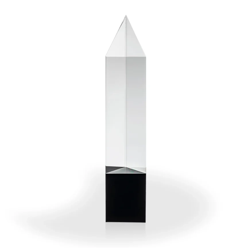 The stately Harrington Crystal Award is the perfect option when you need to commemorate a person or achievements that are special to your organization. The flawless, clear optic crystal “peak” is cut with flat, faceted edges into a stunning tower that tapers to a fine point. The crystal tower is then affixed to a customized black base. 15″ H x 3″ W x 3″ D