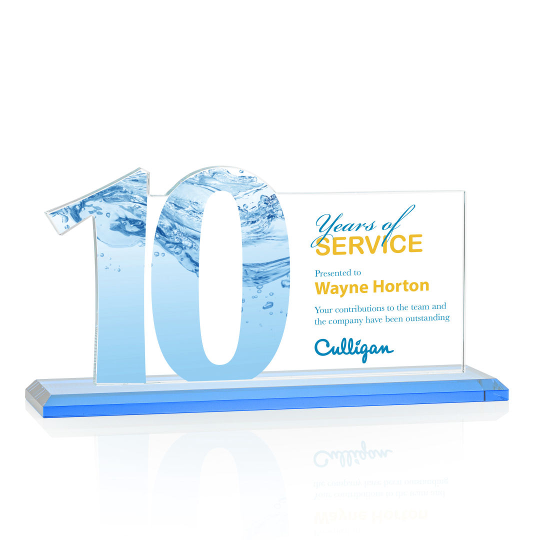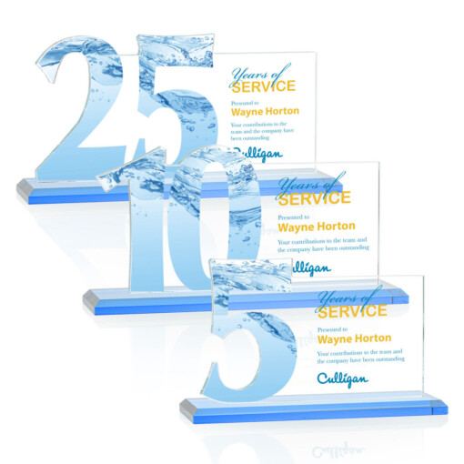 Honor loyalty and dedication with our fantastic Hazelton VividPrint™ Years of Service awards. Recognizing major milestones from 5 to 25 years, these Starfire crystal awards feature beautifully contoured numbers in 5-year increments with a large horizontal pane to imprint your words of appreciation. Available on your choice of clear or colored base. 9.0″ W x 5.5″ H x 3.0″ D