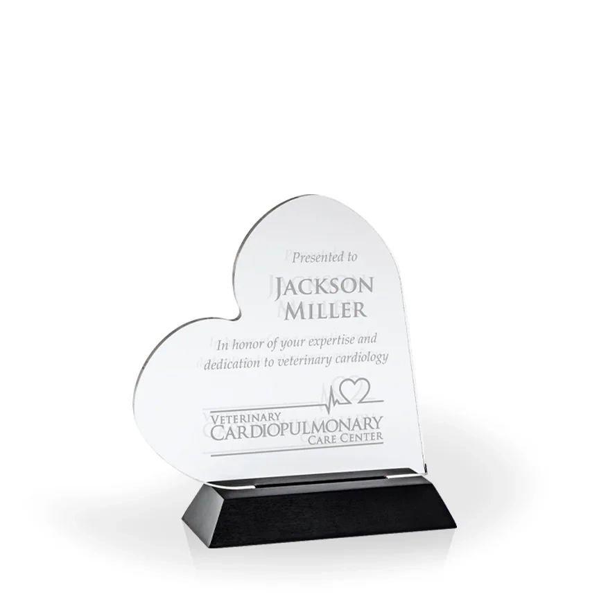 An attractive and affordable award option, our acrylic cutout awards are made in the USA with 1/4″ clear acrylic and a black, beveled wood base. These budget-friendly awards require minor assembly. The acrylic pop-in and wood base are packaged together, un-attached, in a slim-line white tri-fold box. 6″ H x 5.5″ W x 2″ D