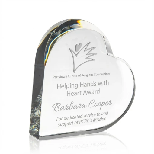 The Heart Keepsake Crystal Award is a special clear optic crystal award. It is a fabulous option when you want to recognize exceptional people that are important to your organization. Recognize the ones with big hearts, that are helping your organization succeed. At 5″ high and 5″ wide, you’ll have ample space to engrave logo(s), recipient information and award text. 5″ H x 5″ W x 1″ Thick