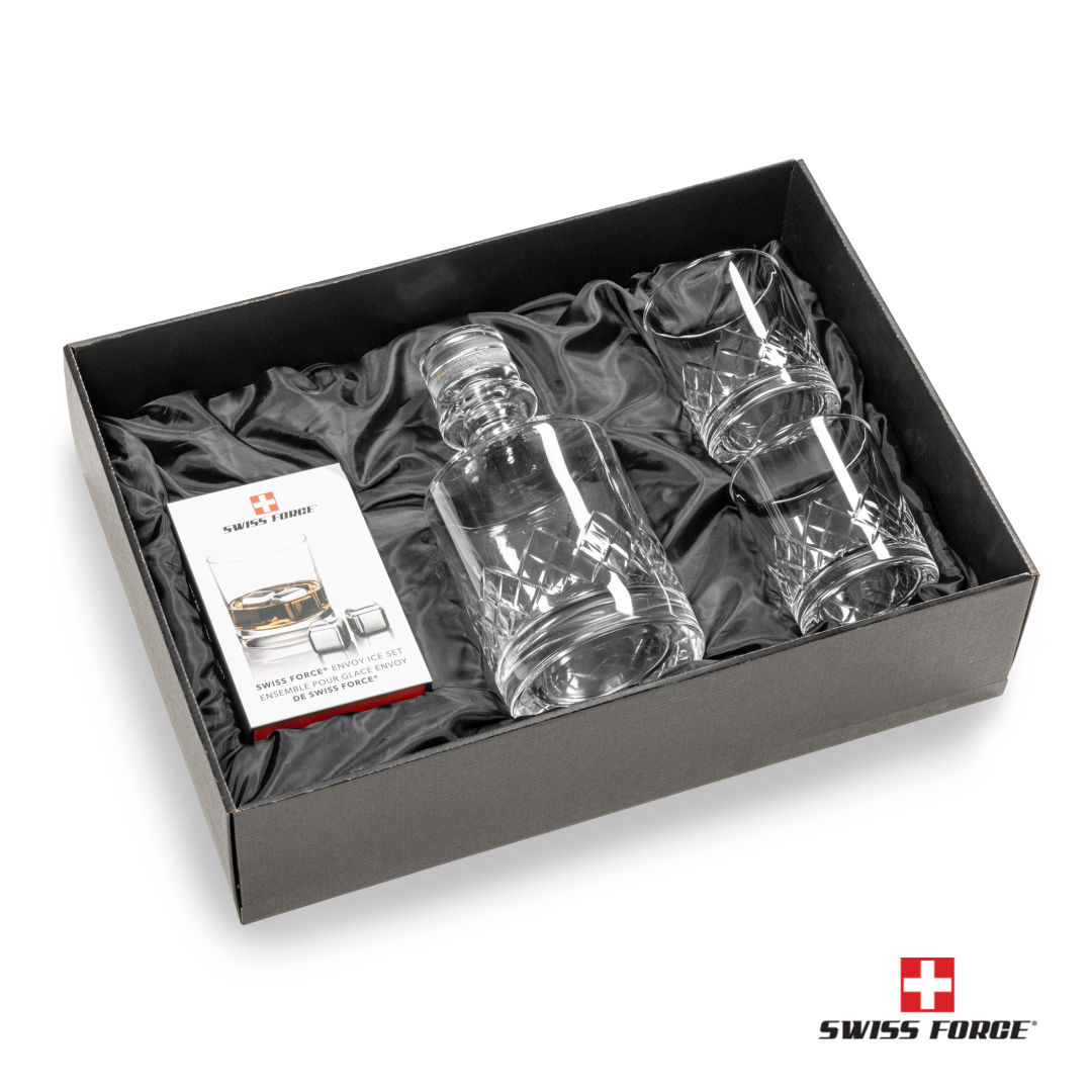 Your choice of Lead-Free Crystalline Decanter is paired with 2 matching glasses and a set of 4 Swiss Force stainless steel ice cubes to keep your drink chilled in a classy way. Packaged in a beautiful satin-lined presentation box, this set creates an unmatched experience for the discerning connoisseur.Capacity: Decanter 28oz, Glass 12oz