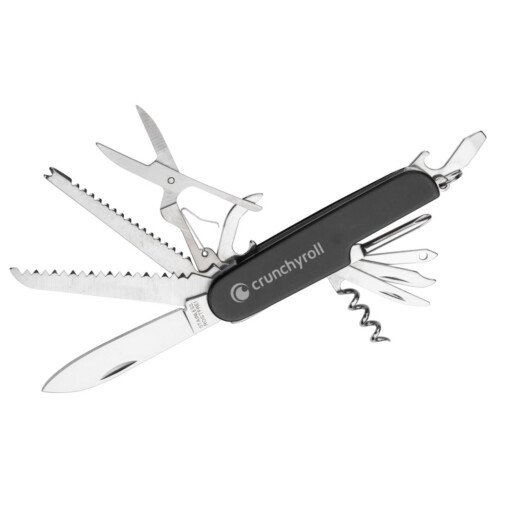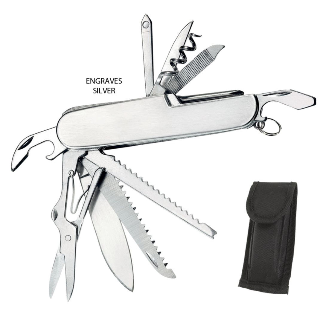 13-function stainless steel pocket knife- FUNCTIONS INCLUDE: nail puller/awl, leather punch, corkscrew, nail file, bottle opener, slot screwdriver, key ring, wood saw, fish scaler, hook remover, blade, scissors, can opener/line bladeProduct Size: 0.875″ x 3.75″. 0.875″ W x 3.75″ H
