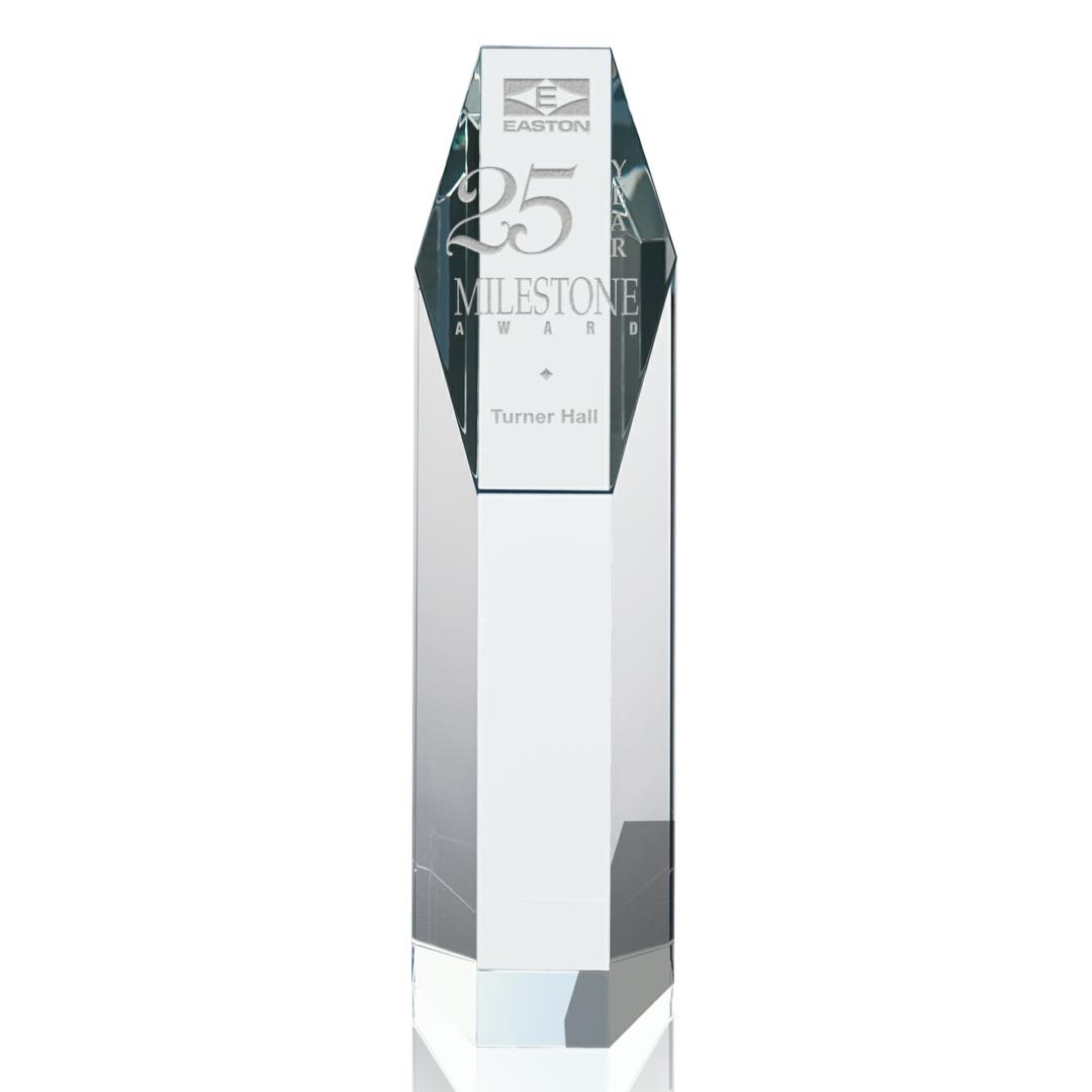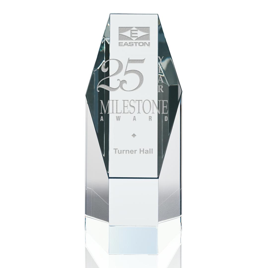The Hexagon Tower is a freestanding, 6-sided pillar of pure optical crystal. The top is steeply cut from back edge to front, producing a hexagonal face for artwork presentation. The multiple, highly polished surfaces of this refined, traditional design accentuate the sparkle and reflectivity of optical crystal. Also available in 7½” and 10″ sizes. 3.0″ W x 5.0″ H x 2.75″ D