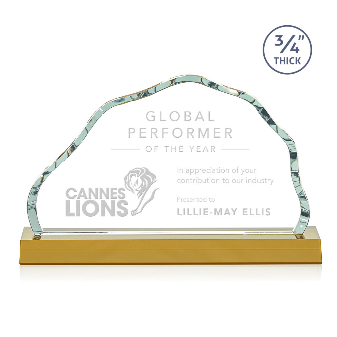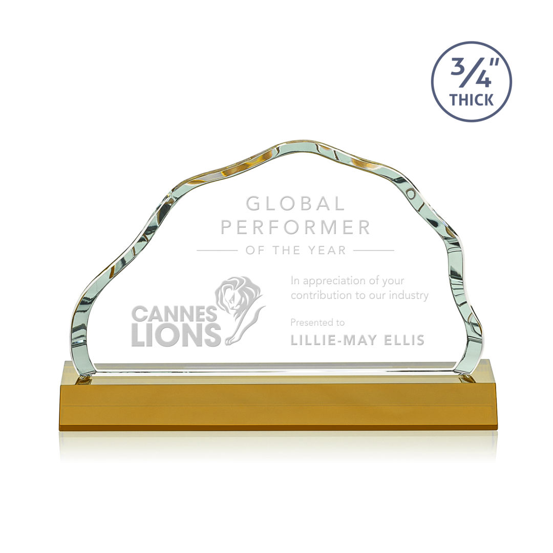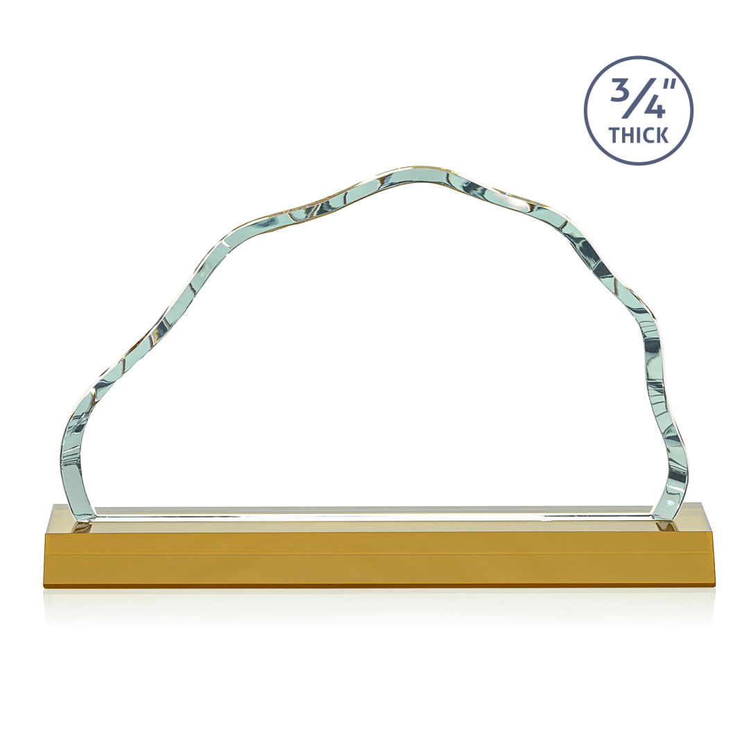The Starfire Crystal Highbridge Award is a magnificent ¾” thick beveled iceberg that forms an incredible frame for your mountainous achievement. The colored crystal base refracts through the edges of the award for a dazzling show of amber reflections. 2nd Position Etch Optional. 5.5″ W x 3.25″ H x 0.75″ D