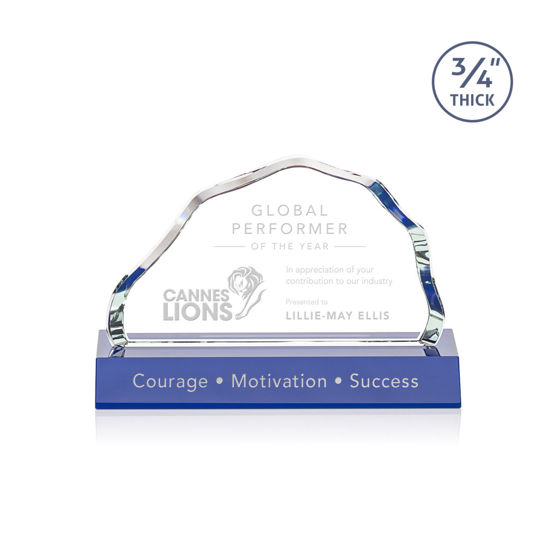 The Starfire Crystal Highbridge Award is a magnificent ¾” thick beveled iceberg that forms an incredible frame for your mountainous achievement. The colored crystal base refracts through the edges of the award for a dazzling show of blue reflections. 2nd Position Etch Optional. 5.5″ W x 3.25″ H x 0.75″ D
