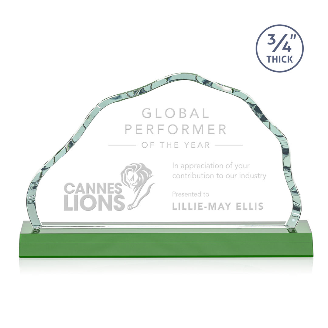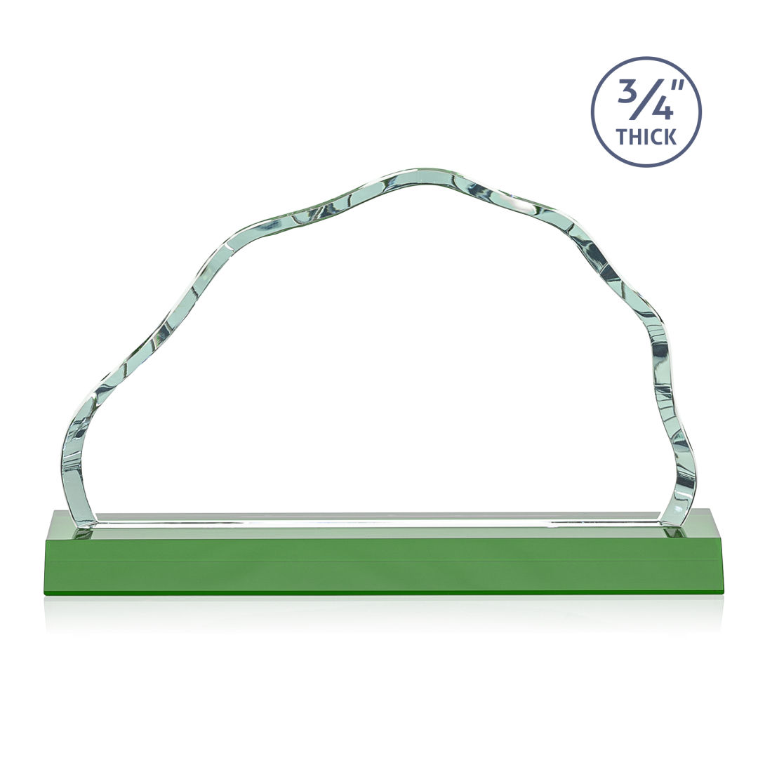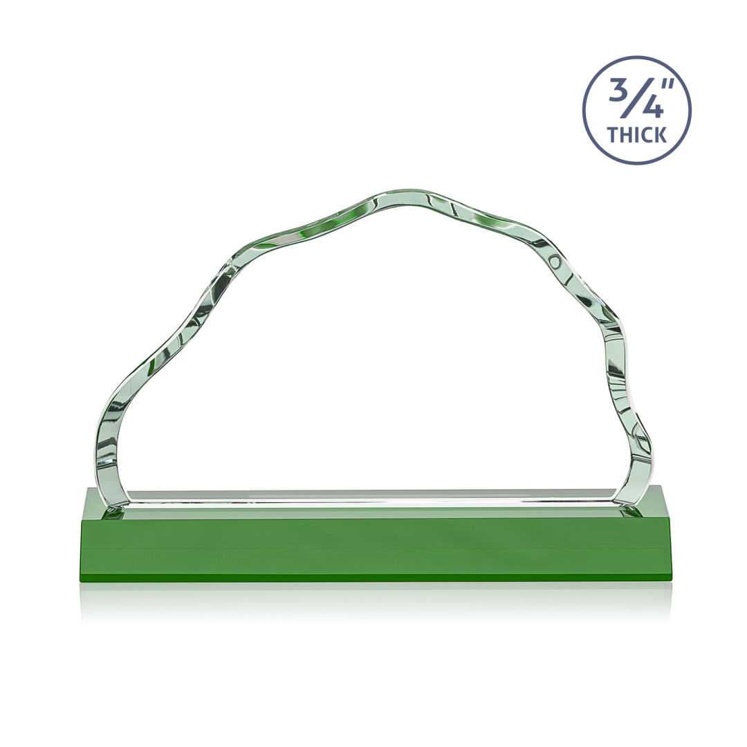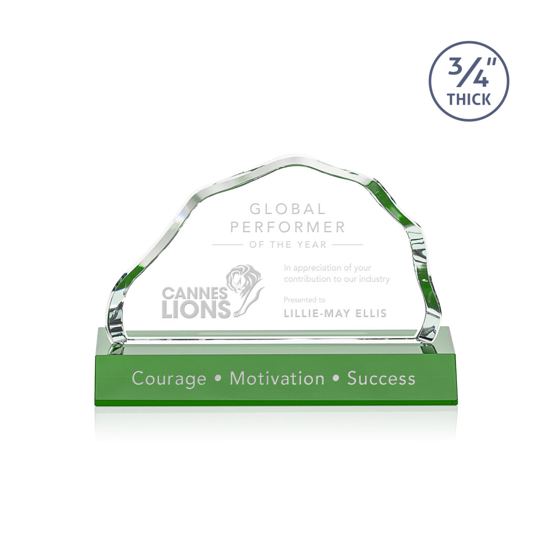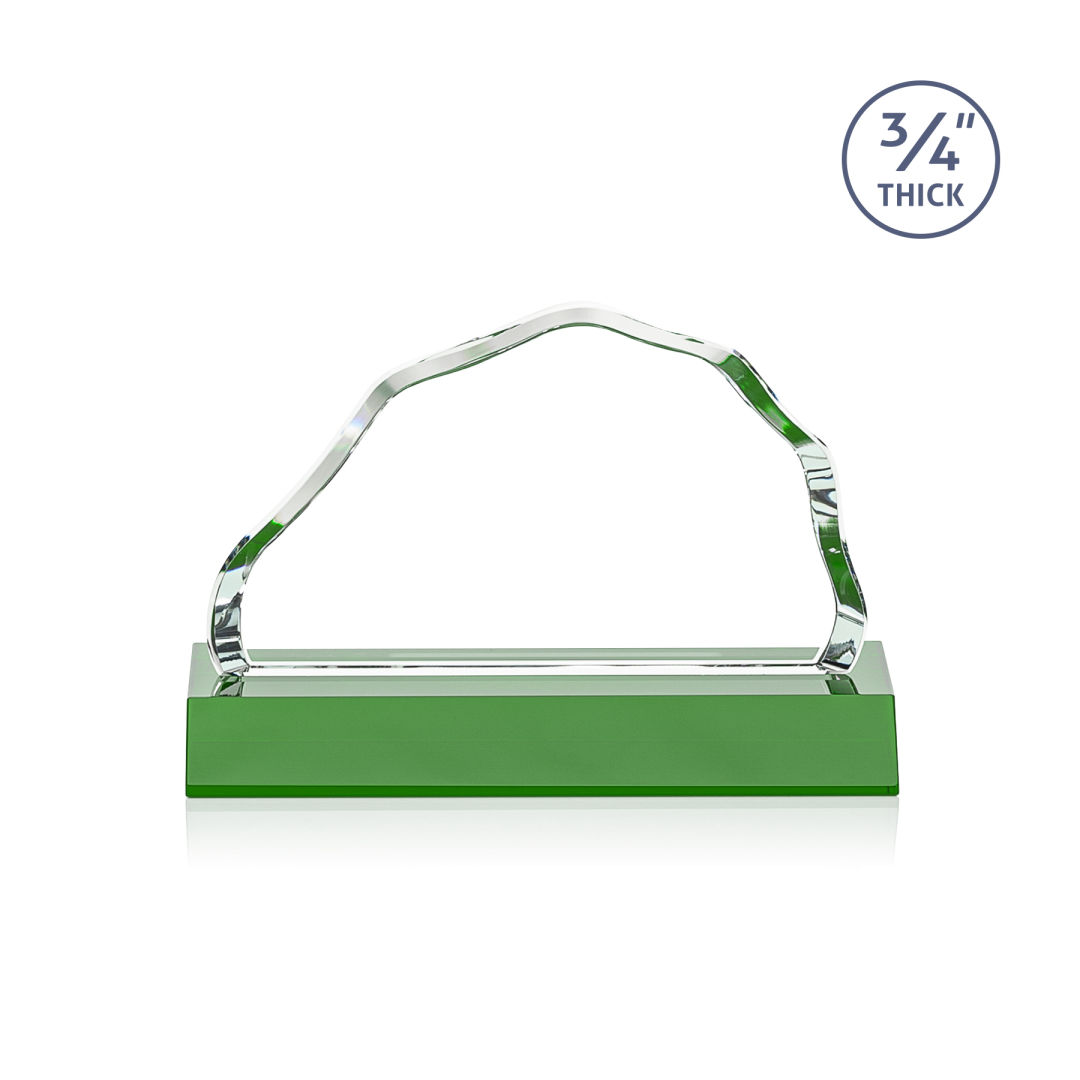 The Starfire Crystal Highbridge Award is a magnificent ¾” thick beveled iceberg that forms an incredible frame for your mountainous achievement. The colored crystal base refracts through the edges of the award for a dazzling show of emerald reflections. 2nd Position Etch Optional. 5.5″ W x 3.25″ H x 0.75″ D