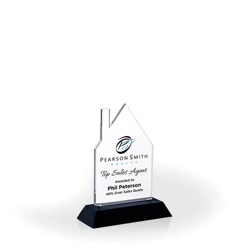 An attractive and affordable award option, our acrylic cutout awards are made in the USA with 1/4″ clear acrylic and a black, beveled wood base. These budget-friendly awards require minor assembly. The acrylic pop-in and wood base are packaged together, un-attached, in a slim-line white tri-fold box. 6.75″ H x 4″ W x 2″ D