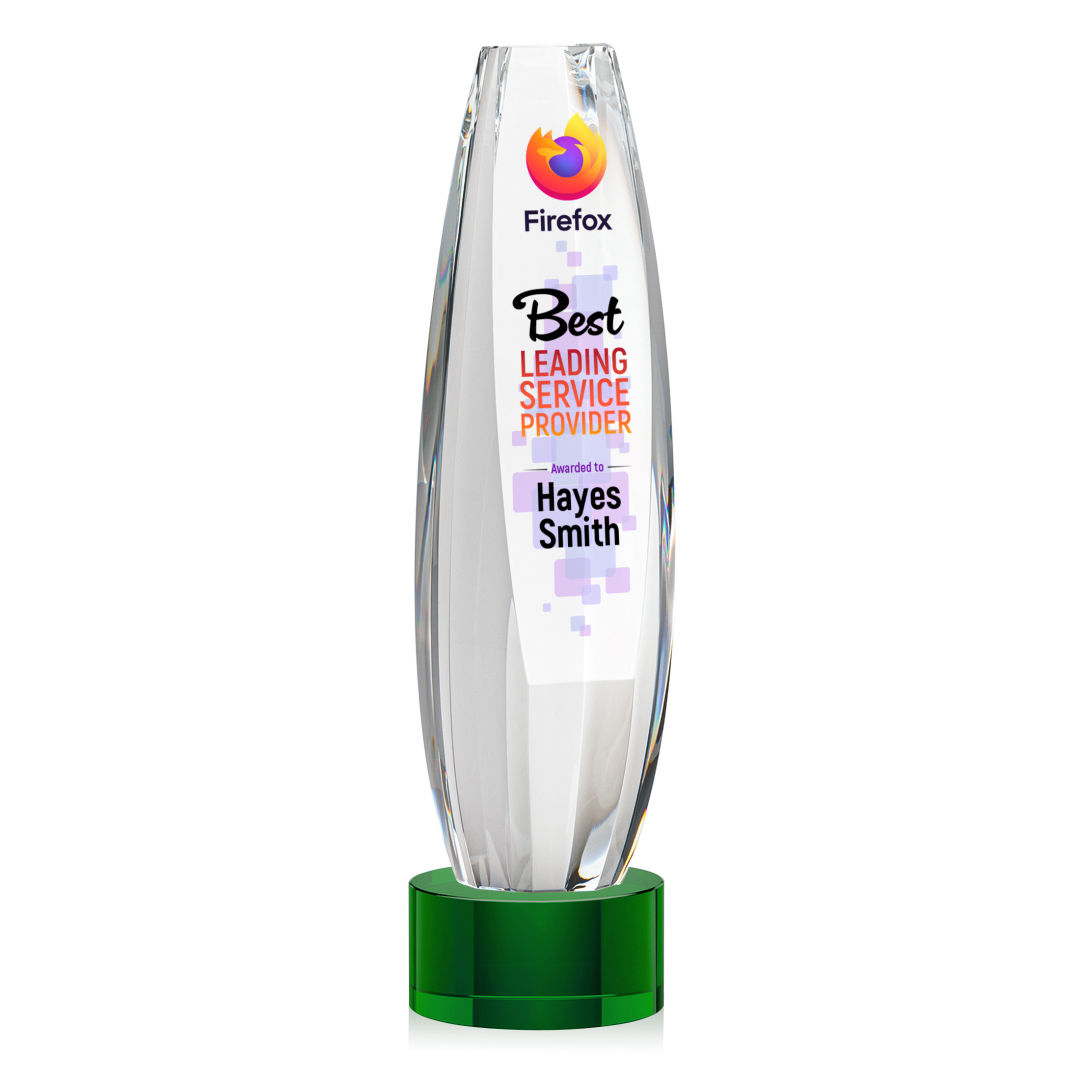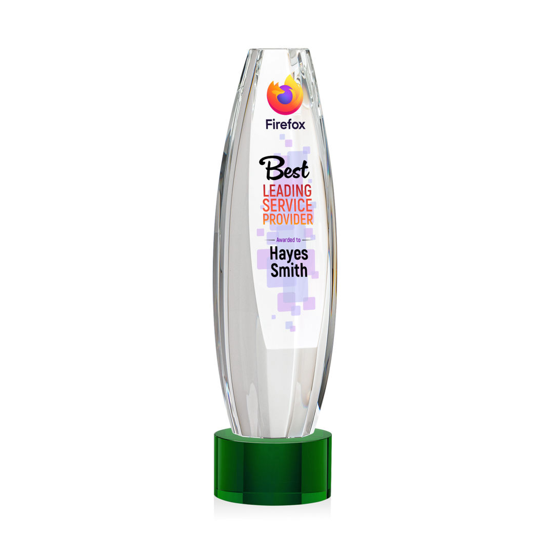 Elevate recognition to an extraordinary level with our magnificent Hoover VividPrint™ Award. Meticulously crafted from Optical Crystal, this multifaceted masterpiece is a symbol of brilliance and achievement. Its dynamic form captures and refracts light, creating a mesmerizing display that epitomizes the heights of excellence. The large sheered off face provides ample room for your words of recognition. Mounted on a Clear, Emerald, Sapphire, or Ebony Optical Crystal Base. Packaged in a black satin-lined presentation gift box. 2.5″ W x 9.5″ H