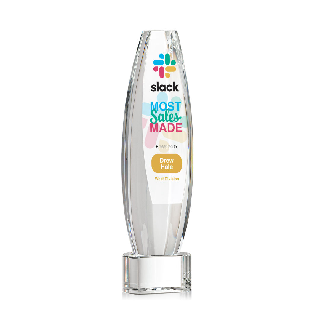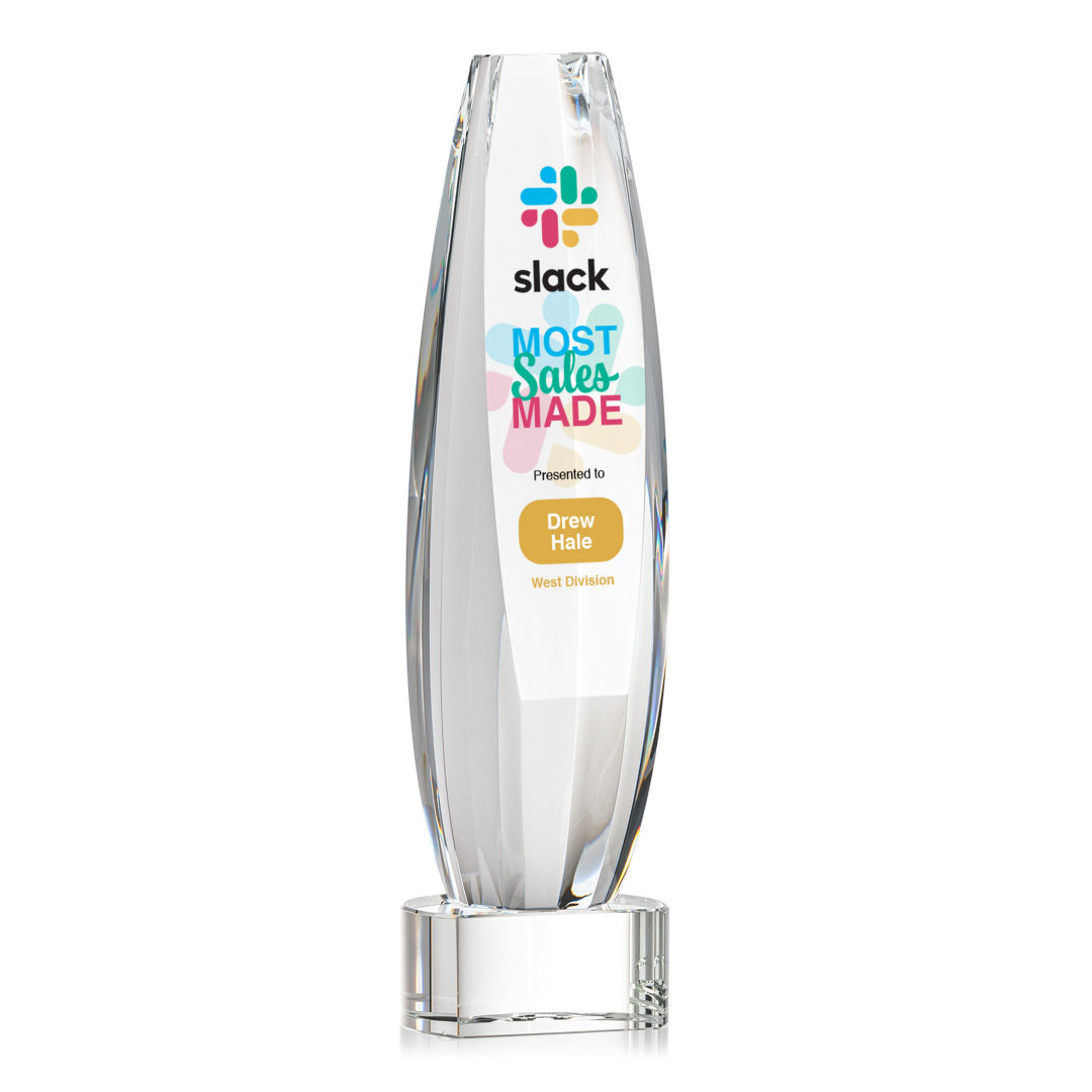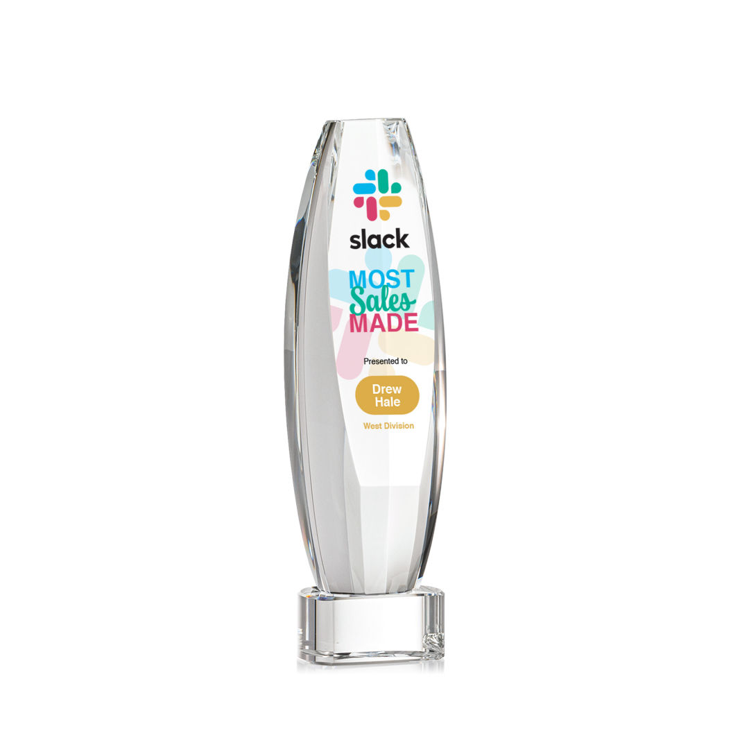 Elevate recognition to an extraordinary level with our magnificent Hoover VividPrint™ Award. Meticulously crafted from Optical Crystal, this multifaceted masterpiece is a symbol of brilliance and achievement. Its dynamic form captures and refracts light, creating a mesmerizing display that epitomizes the heights of excellence. The large sheered off face provides ample room for your words of recognition. Mounted on a Clear, Emerald, Sapphire, or Ebony Optical Crystal Base. Packaged in a black satin-lined presentation gift box. 2.5″ W x 9.0″ H