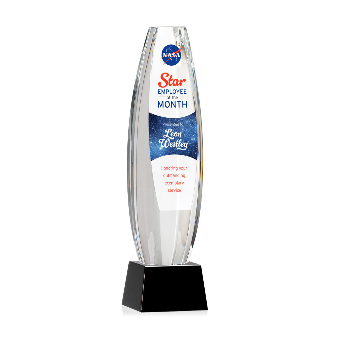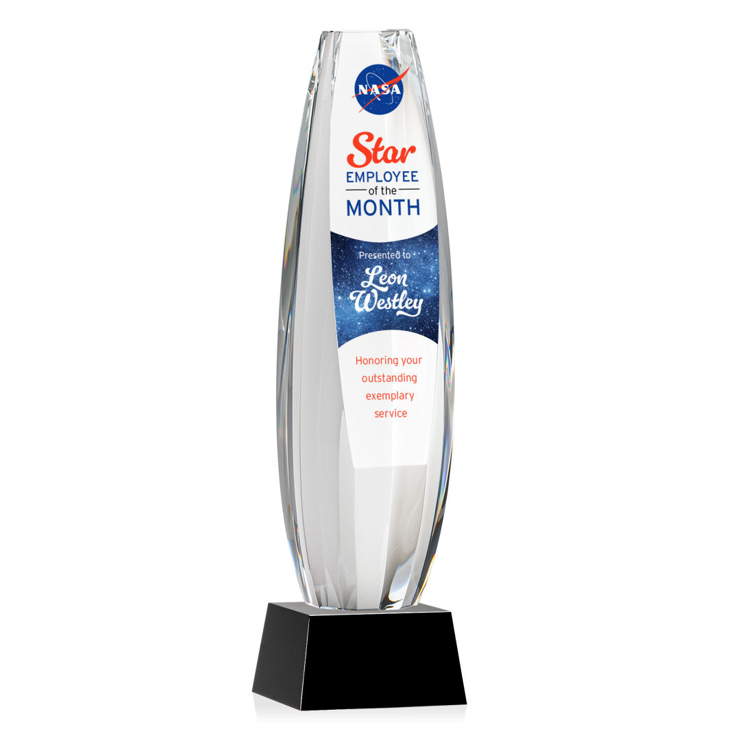 Elevate recognition to an extraordinary level with our magnificent Hoover VividPrint™ Award. Meticulously crafted from Optical Crystal, this multifaceted masterpiece is a symbol of brilliance and achievement. Its dynamic form captures and refracts light, creating a mesmerizing display that epitomizes the heights of excellence. The large sheered off face provides ample room for your words of recognition. Mounted on a Clear, Emerald, Sapphire, or Ebony Optical Crystal Base. Packaged in a black satin-lined presentation gift box. 2.5″ W x 10.0″ H