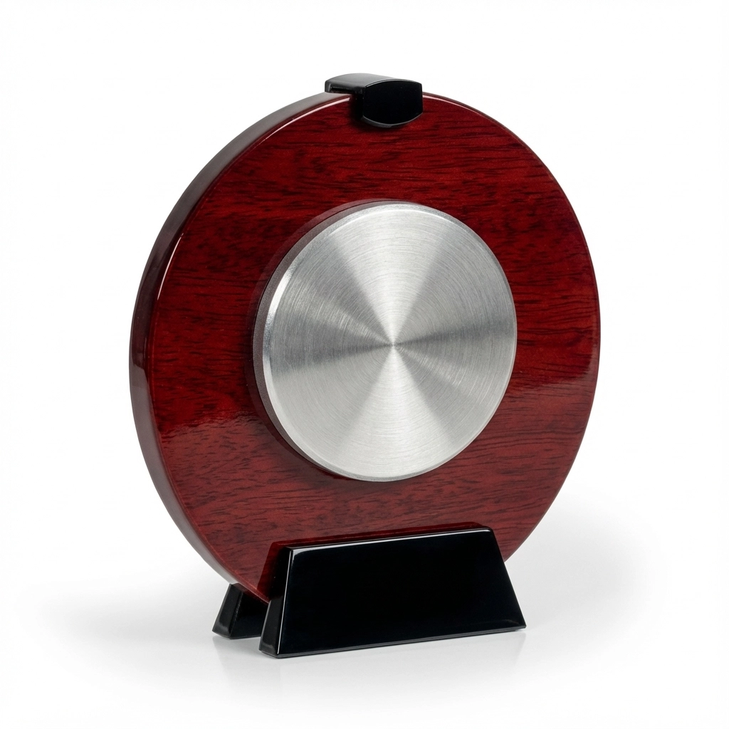 This stunning clock offers a striking blend of traditional, richly colored rosewood with a fun swivel feature that allows for movement and easy viewing from wherever the clock is placed. The Roman numerals and clock dial are centered within a round piece of glass, that swivels in the center of two upsweeping “arms” of beautiful rosewood. This Thomas Dale Co. Hora Rosewood Swivel Desk Clock stands at 7-5/8″ tall and features a personalized, polished black aluminum nameplate. 7.625″ H x 7.625″ W x 1.875″ D