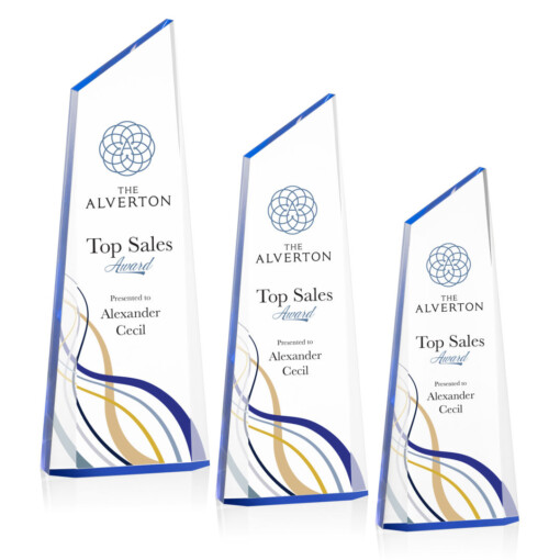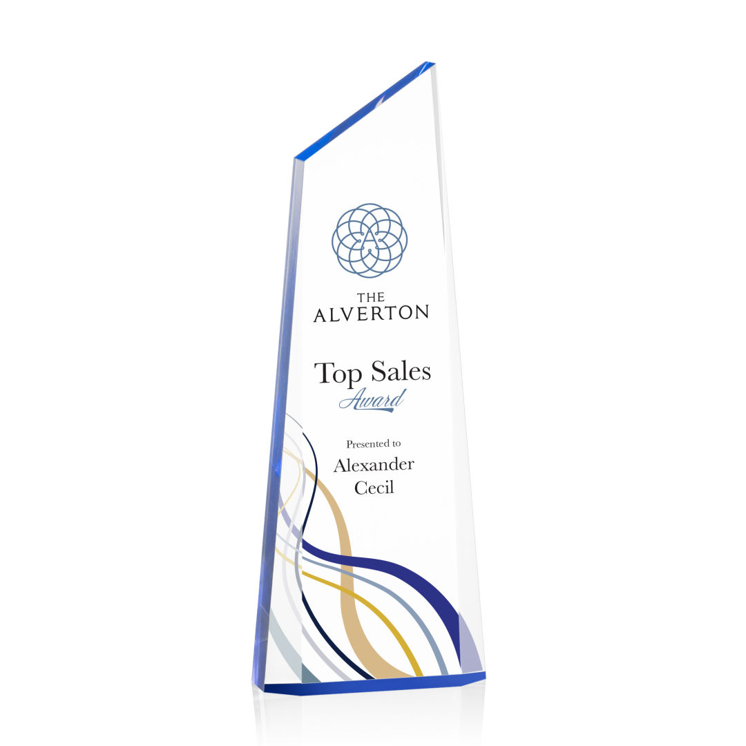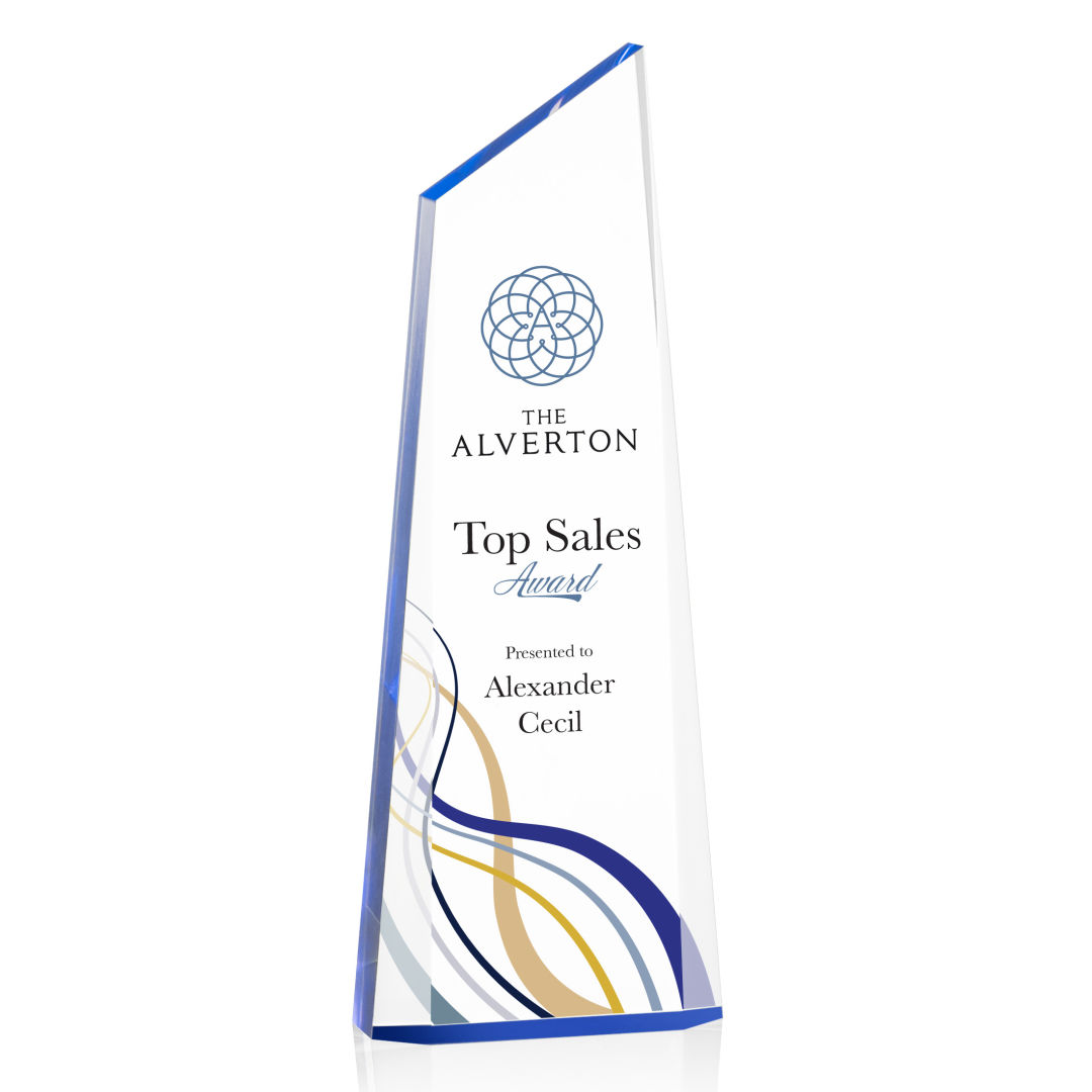 The exquisite Hudson VividPrint™ Award is a tall freestanding acrylic award with beveled sides and a top peak on the right side. What sets this award apart is the captivating play of color that reflects throughout the entire piece. Choose between mesmerizing sapphire or radiant gold. The peak on the right side symbolizes reaching new heights and milestones, making it the perfect choice for recognizing outstanding accomplishments like Top Sales! 3.125″ W x 8.0″ H x 1.125″ D