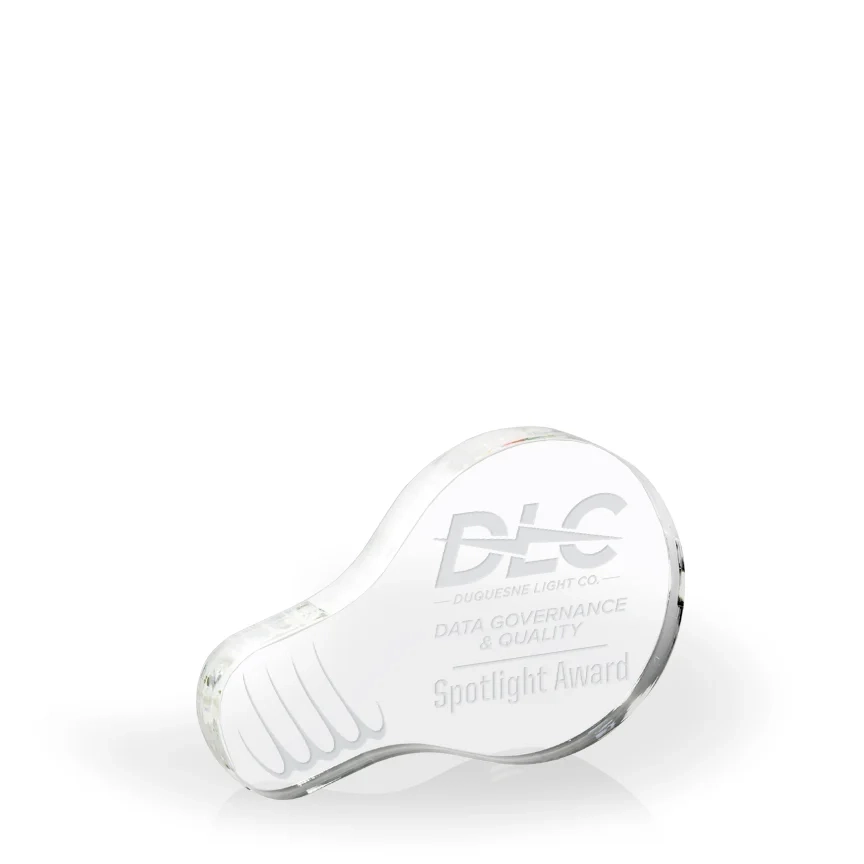 100% made in USA, the Illuminate Acrylic Light Bulb Paperweight is a lovely reward for a bright idea. The small size is pefect for a desktop and the economical price makes it perfect for recognizing entire teams for their innovative contributions. 2 1/2″ H x 4 1/2″ W x 1/2″ D