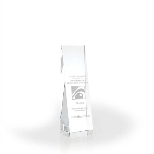 The Incline Crystal Awards are gorgeous clear optic crystal awards. Designed with a contemporary flair, these pieces have a slanted front face that make them an impressive addition to any recognition program. This award features a huge amount of engraving space on the front face, perfect when you have more than 1 logo to engrave along with your award text, or when you want to engrave a quote. The Incline is one of our most popular awards, used for a wide variety of vendor and dealer Awards, contest winners, years of service, sales, and general employee and staff awards and recognition. 8″ H x 2.8″ W x 2″ D