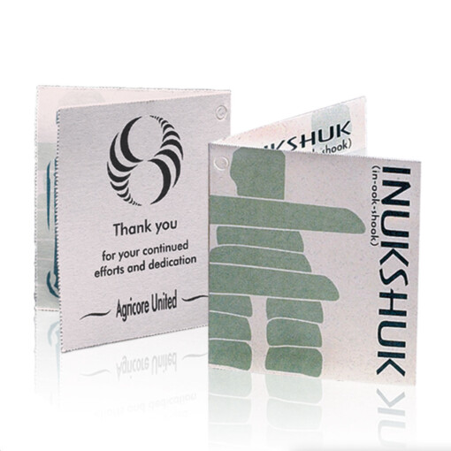 The very attractive Inukshuk on Sommerville Pen Set features a black pen with silver-finish trim and holder, flanked by a frosted Mini Inukshuk figure, on a black mirror and piano-finish wood base. A similar item with gold-finish trim and holder is also available. The iconic Inukshuk, emblematic of the traditional nomadic Inuit of the eastern arctic, is symbolic of cooperation and interdependence. 4.0″ W x 8.0″ H