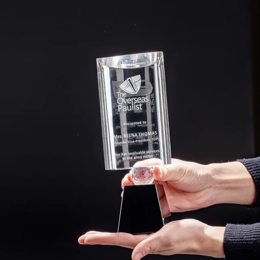 The Julia Award features a semi curved clear Optic Crystal top mounted to a black Crystal Base with a gorgeous Faceted Crystal Ball in the center. Each Julia Award is shipped in a premium quality presentation box. 3.5″ L x 2.5″ W x 9.5″ H