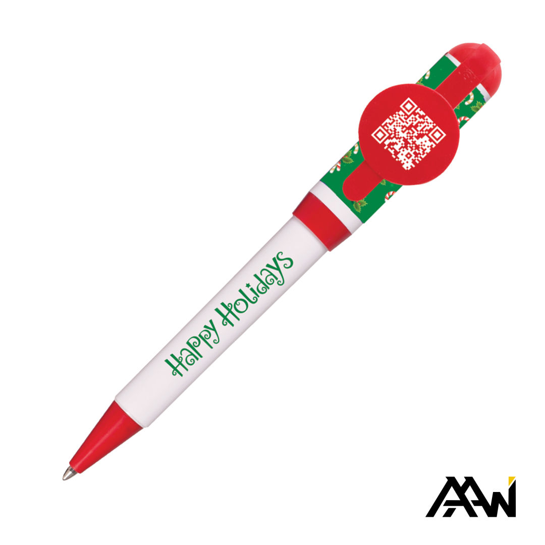 The Jumbo QR Billboard Twist Pen with Decorated Cap is a fun and functional way to promote your brand while sharing digital content through a scannable QR Code clip imprint. This billboard-style jumbo twist pen features pre-decorated cap designs in Patriotic Stars, Pink Ribbons, or Holiday Candy Canes, along with a single-color silk screen barrel imprint for added customization. Measuring 5.5″ high and filled with smooth black ink, this pen combines eye-catching style with tech-friendly engagement, perfect for campaigns, fundraisers, and seasonal promotions. (Note: Flowcode QR Codes are not compatible; traditional QR Codes scan at 0.4″ x 0.4″, while ours measures 0.73″ x 0.73″.)Please note that minimum quantities are per color. Colors cannot be mixed to meet the required minimum order quantity. Pen size: 5.5″ W. 5.5″ W