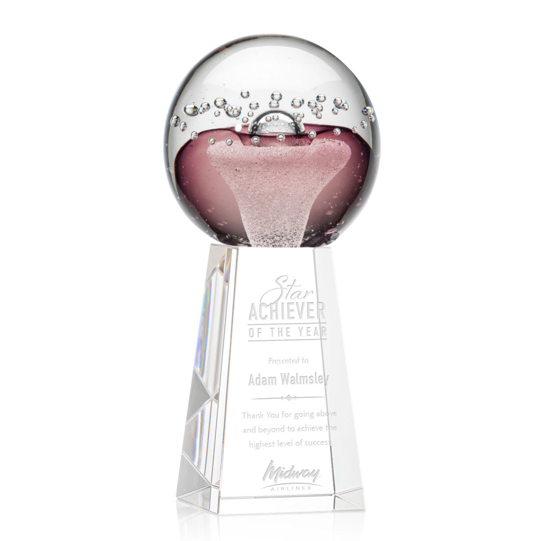 The Jupiter Award featuring a cosmic display of ruby red art glass and clear bubbles to create a majestic award to commemorate your special achievement. Mounted on a tall tapered Novita Optical Crystal Base. Each piece is individually hand crafted and no two pieces are identical. 4.0″ W x 9.0″ H x 4.0″ D
