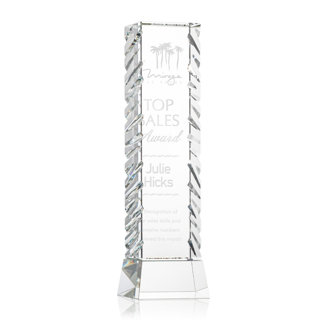 The Kaleidoscope Tower combines monolithic elegance with minimalist styling to create this exceptional gallery quality award. Diagonal faceted cuts reflect light at random angles to create a piece that glows with sparkling light. Mounted on a tapered Optical Crystal base in your choice of 4 colors. 3.75″ W x 14.0″ H x 3.75″ D