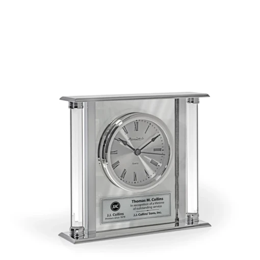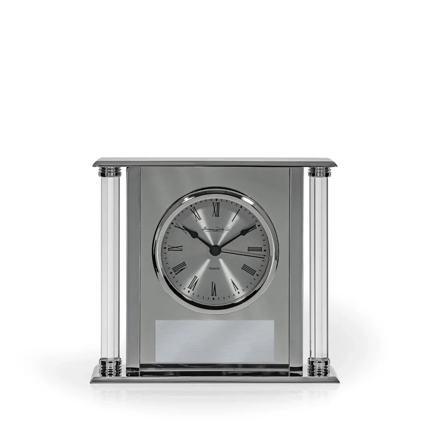 The Kannada Mirrored Clock by Thomas Dale Co. features a round face with Roman numerals and a mirrored finish that reflects light beautifully. This gift is perfect for displaying on a desktop, standing 6″ tall, and features space on the mirrored front panel to which a personalized nameplate can be affixed. 6″ H x 6.75″ W x 1.75″ D