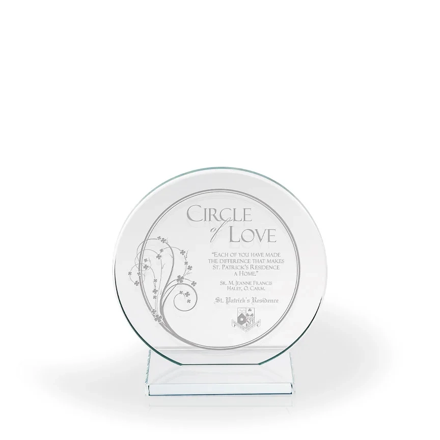 The Karla Glass Circle Award is a versatile choice for any award program. The front of the award offers plenty of space for engraving award information to commemorate deserving individuals or teams. This award is available in three sizes, 4 1/2″ tall, 6 3/8″ tall, and 8 1/2″ tall. 6.375″ H x 6.25″ W x 3.1875″ D